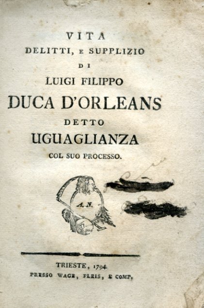 In-16° (175x120mm), pp. 128, brossura originale. Vignetta incisa al titolo. Computi e annotazioni di mano antica al piatto e ai contropiatti. Una firma cassata al titolo. Una mancanza al margine inferiore dell'ultima c., con perdita di alcune lettere di testo. Fioriture e alcune tracce d'uso. Discreto esemplare in barbe. Unica edizione, rara e pubblicata in forma anonima. Luigi Filippo II di Borbone-Orléans, detto Philippe Egalité (Saint-Cloud, 1747-Parigi, 1793), l'unico figlio maschio del Duca d'Orléans Luigi Filippo I di Borbone-Orléans e della moglie Luisa Enrichetta di Borbone-Conti, fu il padre del futuro Re di Francia Luigi Filippo. Sostenitore della Rivoluzione Francese, fu deputato della nobiltà agli Stati Generali, per poi unirsi al Terzo stato. Iscrittosi nelle file dei Giacobini, fu eletto deputato alla Convenzione nel 1792 e, ancorché fosse cugino di Luigi XVI, votò a favore della sua esecuzione. Coinvolto nel tradimento del generale Dumouriez, fu arrestato e ghigliottinato all'inizio del Terrore.