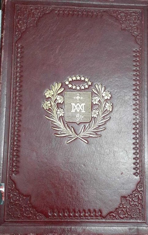 Copertina in pelle rigida, con titolo dorato e fregi oro al piatto, con segni d'uso. Tagli rossi, pagine ingiallite. Copia di biblioteca estinta. 407 Mediocre (Poor) .