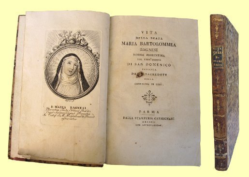 In 8vo (cm 21x13,5). Mezza pelle coeva titolo e fregi in oro al dorso. Antiporta con ritratto in rame a piena pagina della Beata inciso da Lasinio figlio. Pag. XVI-189-1. -- La Venerabile nata a Firenze nel 1514 ebbe poteri di guaritrice.