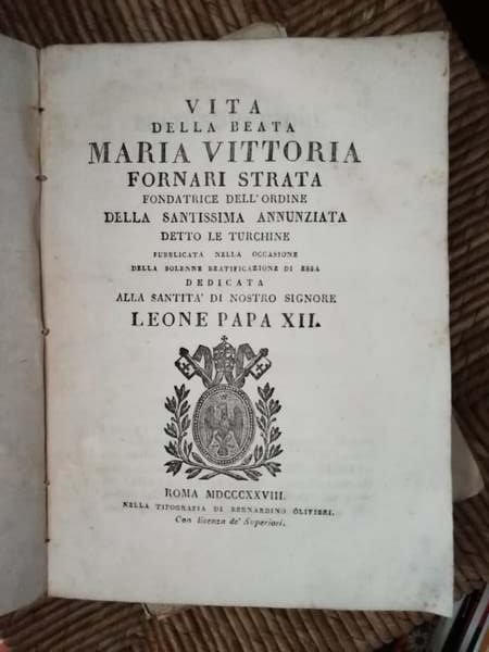 PRIMA EDIZIONE Maria Vittoria de Fornari Strata venne beatificata da papa Leone XII il 21 settembre 1828. In occasione della sua beatificazione, quello stesso anno, venne pubblicato una biografia in italiano dal titolo Vita della B. Maria Victoria Fornari-Strata, fondatrice dell'Ordine della Santissima Annunziata detto «Le Turchine» Incisione in antiporta. Copertina in brossura coeva. Pp. 229. Ottime condizioni.