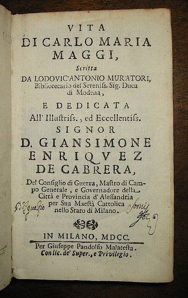 12mo (cm. 14), 8 cc.nn., 286 pp. (manca la carta bianca finale) con un ritratto rip. f.t. Legatura coeva in piena pergamena con titolo ms. al ds. Tagli colorati a spruzzo. Ottimo esemplare. Edizione originale. Vinciana, 2502; Gamba, 1989.
