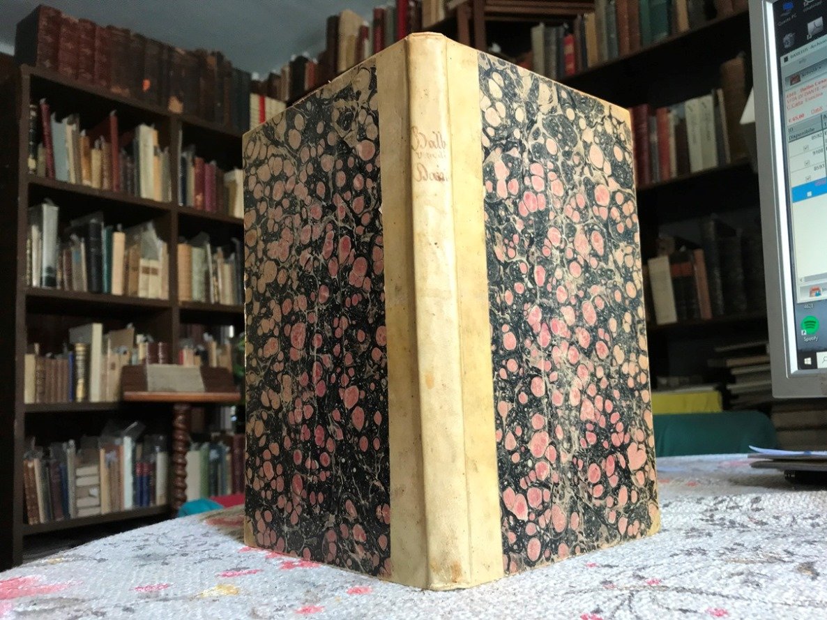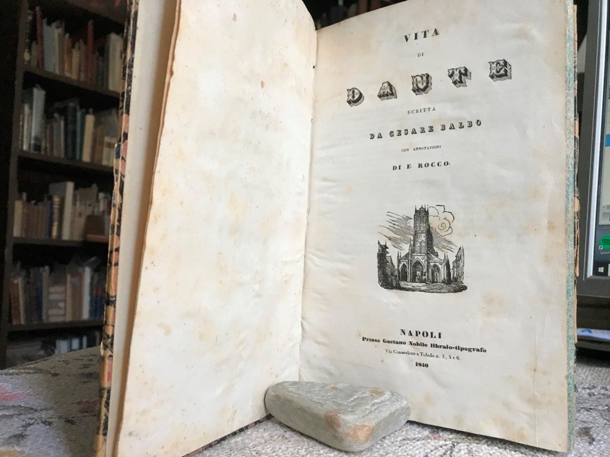 Volume in 8 grande legato in mezza pergamena d'epoca, titolo calligrafico al dorso, piatti marmorati, sguardie, occhiello, frontespizio con bella vignetta silografica, 180 pp. L'interessante saggio del Balbo sulla vita del Ghibellin Fuggiasco. Di grande correttezza filologica e storica. Brunitura alla carta docchiello e lievi fioriture della carta. In pi che buono stato, notevole.