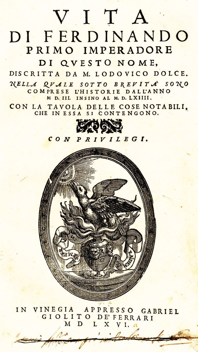 >in-4 (225x155 mm), pp. (24), 254 (i.e. 258), (2), bella legatura in pergamena floscia coeva, titolo ms. al dorso e qualche traccia ms. al piatto anteriore. Impresa tipografica al titolo, e altra, sempre della Fenice, al verso dell'ultimo f.; testate e capilettera xilografici. Prima edizione della vita di Ferdinando I d'Asburgo, imperatore (1503-64). Figlio dell'arciduca Filippo il Bello e di Giovanna la Pazza; fratello minore di Carlo V, gli succedette nel 1558 dopo la sua abdicazione. Ottimo esemplare, freschissimo salvo macchietta al frontespizio; firma di possesso ms. all'occhietto ed altra cassata al frontespizio, qualche manula e nota coeva nei margini. Adams, I, p. 361 - STC p. 222. Bongi, Annali,II, p. 217.