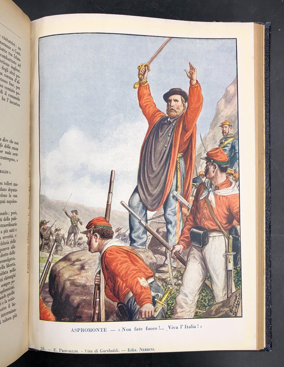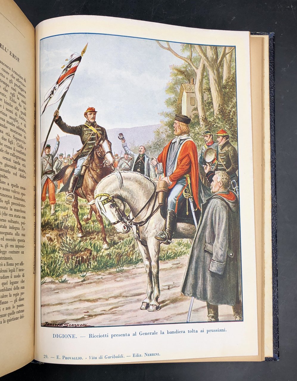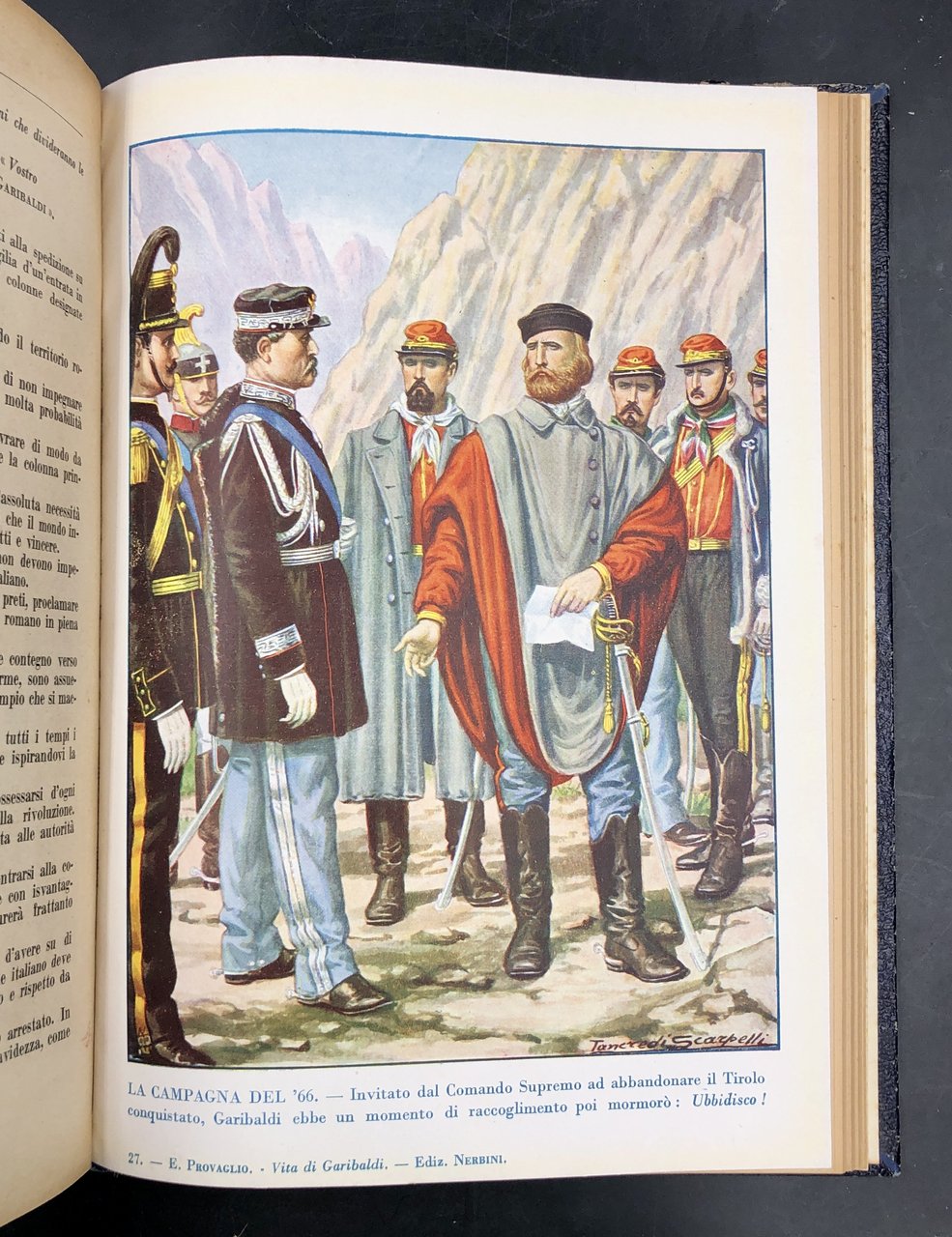 Opera completa in 30 dispense rilegate in uno spesso vol. in-4° (cm. 27,8x20), pp. 474, (1) + 30 belle TAVOLE a vivaci COLORI f.t., quasi tutte di Tancredi SCARPELLI e molte ILLUSTRAZIONI b.n. n.t. anche a piena pag. da varie stampe, disegni e pubblicaz. Robusta mz. tela coeva muta con grande bel RITRATTO a COLORI di GARIBALDI (con buchetto) disegnato da E. NIEVO appl. in cop. (ritratto che appare anche all'interno).