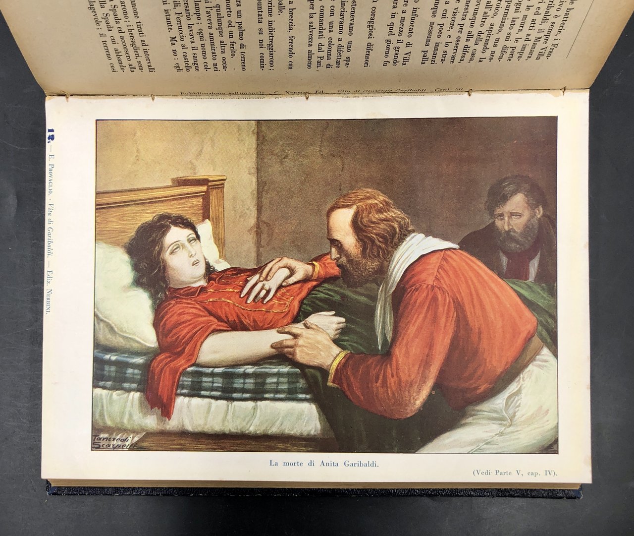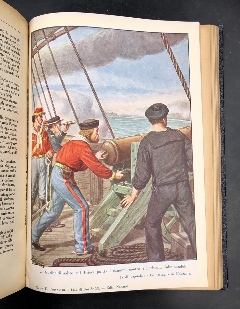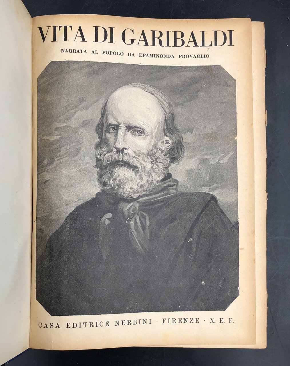 Opera completa in 30 dispense rilegate in uno spesso vol. in-4° (cm. 27,8x20), pp. 474, (1) + 30 belle TAVOLE a vivaci COLORI f.t., quasi tutte di Tancredi SCARPELLI e molte ILLUSTRAZIONI b.n. n.t. anche a piena pag. da varie stampe, disegni e pubblicaz. Robusta mz. tela coeva muta con grande bel RITRATTO a COLORI di GARIBALDI (con buchetto) disegnato da E. NIEVO appl. in cop. (ritratto che appare anche all'interno).