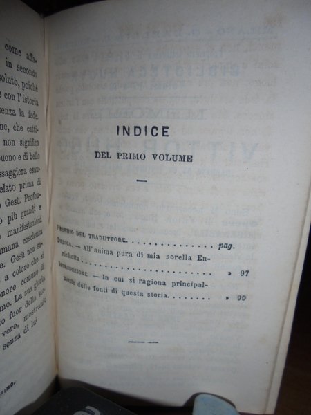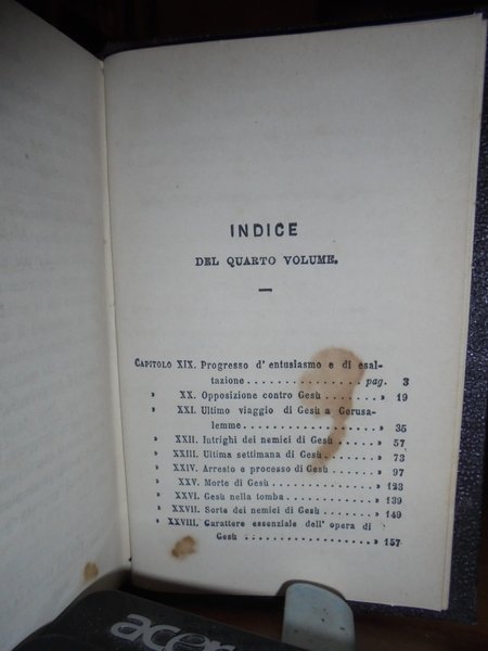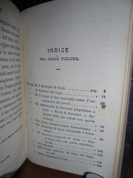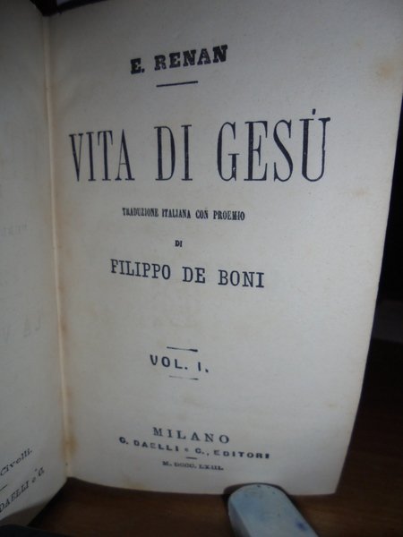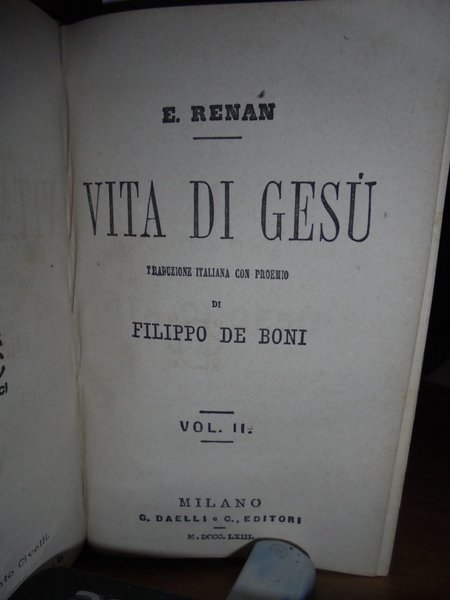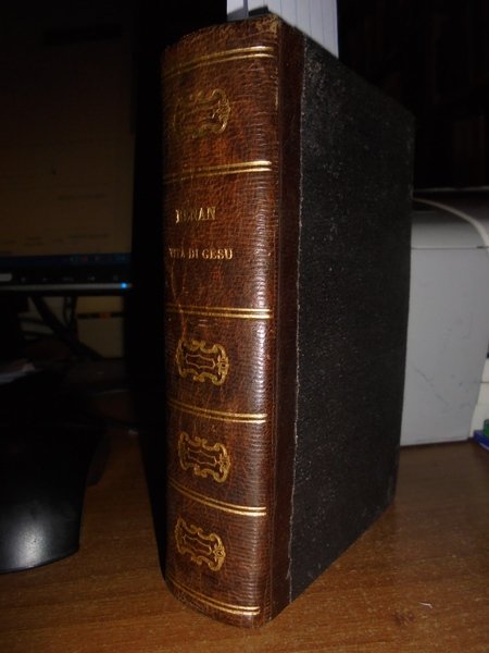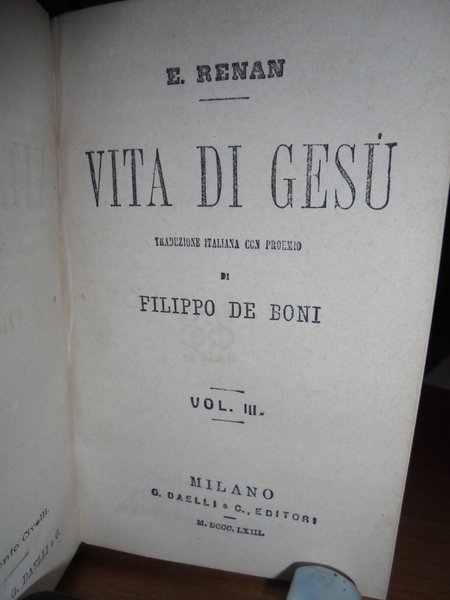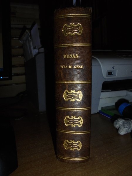 E. Renan. Milano, G. Daelli e C. Editori, 1863. Vita di Gesù. Traduzione italiana con proemio di Filippo De Boni. In-16° (15 x 10 cm.), m.pelle coeva con fregi e titolo in oro al dorso. 4 volumi legati assieme. 156, (2) pp.; 166, (1) pp.; 178, (1) pp.; 180 pp. Ottimo esemplare con alcune macchioline negli indici finali. Opera messa all'Indice dalla Chiesa Cattolica nel marzo del 1863. Neg. mob. nero W