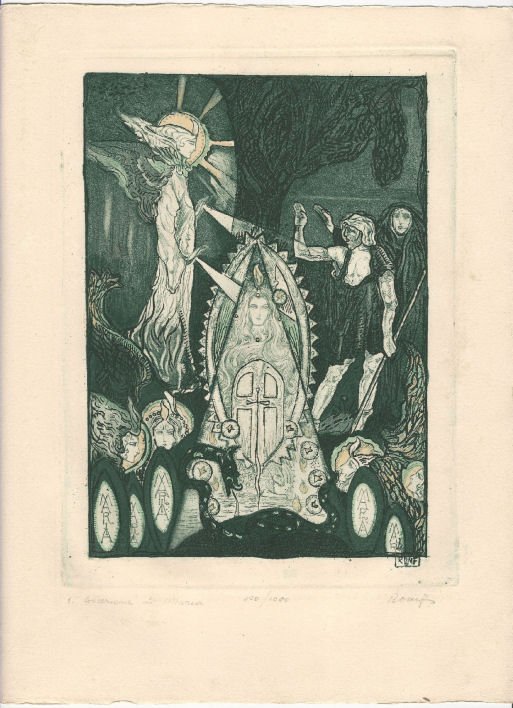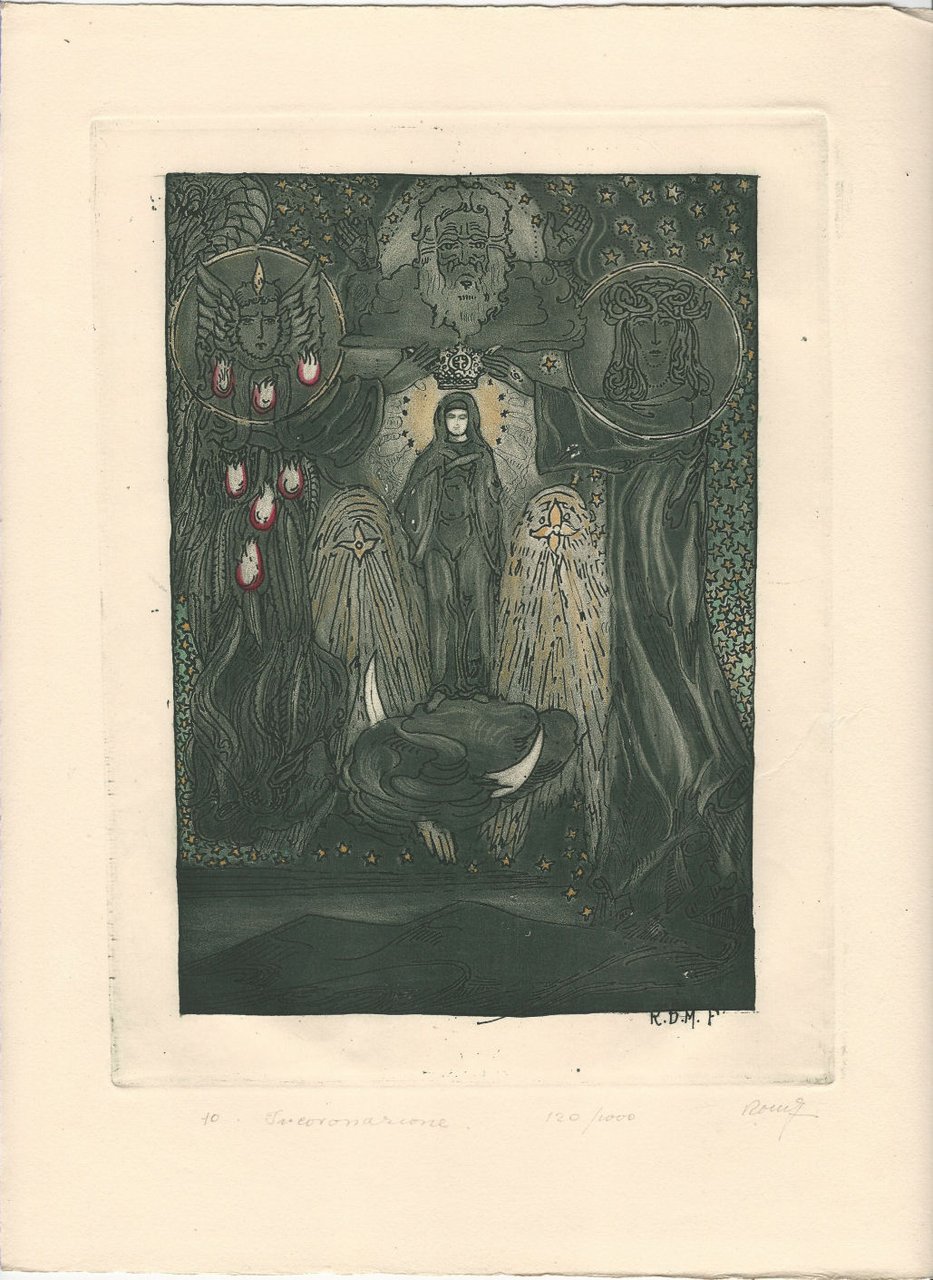 In folio, p. 16 con testi, esplicativi delle tavole, di vari autori insieme a numerosi disegni dell'artista e 10 grandi acqueforti originali a più colori ritoccate all'acquerello, tutte con la didascalia autografa e firmate RDMF a matita. Cartella editoriale con titolo a due colori e con un'altra incisione a colori sulla copertina anteriore, firmata e numerata. La tiratura dichiarata dall'artista e' di 1000 esempl. (ns. n. 120), ma molto probabilmente, vista la grande rarità dell'opera si tratta di una tiratura di gran lunga inferiore.