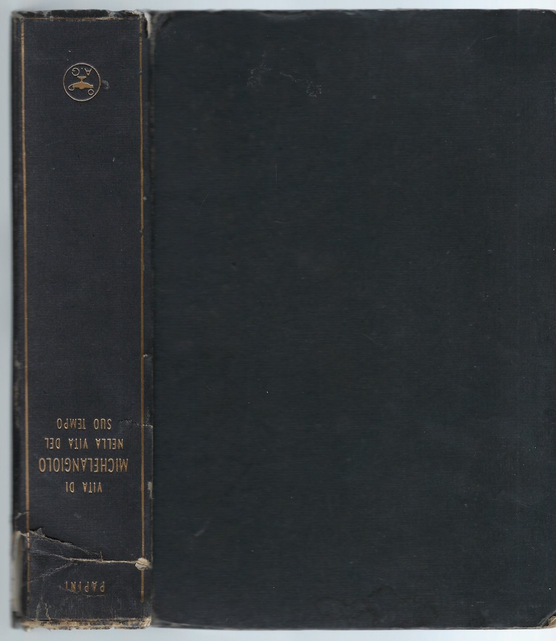 Legatura editoriale in tutta tela con fregi e titoli dorati. Presenta delle parti rovinate, come nella parte superiore del dorso, strappi, abrasioni, macchie ed angoli consumati.