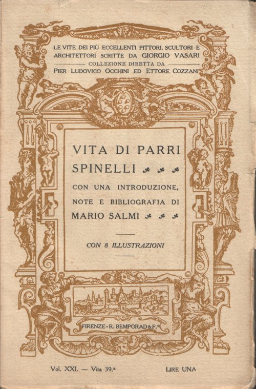 In-16° (cm 18x11,7), pp. 50, (6), copertina editoriale illustrata, con normali segni d'uso e una leggera abrasione nella parte inferiore della copertina posteriore. Con 8 tavole di illustrazioni in bianco e nero fuori testo. Buon esemplare, intonso. Volume XXI - Vita 39.a nella collezione "Le vite dei più eccellenti pittori, scultori, e architettori scritte da Giorgio Vasari", diretta da Pier Ludovico Occhini ed Ettore Cozzani. Indice: Introduzione; Vita di Parri Spinelli; Note; Elenco cronologico delle sue opere; Documenti; Bibliografia e iconografia; Indice delle illustrazioni.