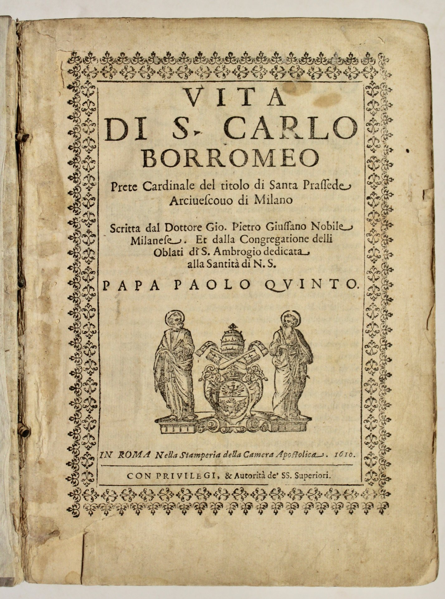 In 4° (mm 223x160); pagg. (10), 716 (ma 692 per errata numerazione), (54). Titolo manoscritto al taglio inferiore. Silografia al frontespizio con stemma di Paolo V attorniato dai Santi Pietro e Paolo. Cartonato ottocentesco con carta anticamente applicata al dorso, titolo manoscritto sullo stesso. Edizione originale di quella che è considerata la più completa descrizione della vita di San Carlo Borromeo, cardinale di Milano. <BR>Buon esemplare, ma scompleto della prima carta contenente il ritratto di Borromeo. Piccole mancanze marginali al frontespizio; piccolo foro alla seconda carta e alla c. Cc4 con minima perdita di testo; qualche arrossamento e traccia di sporco superficiale; fra pag. 472 e 473 le cuciture interne sono rotte parzialmente. Mancanza dell'angolo inferiore della carta Qq4. Qualche leggera menda alla legatura.