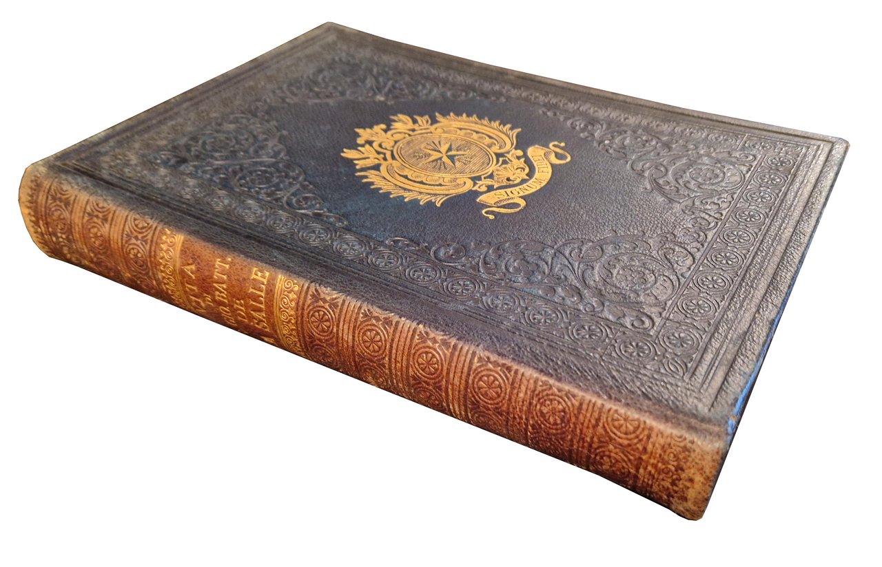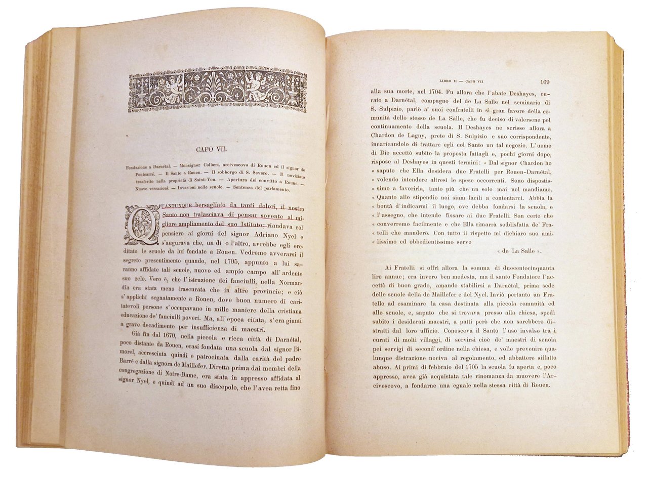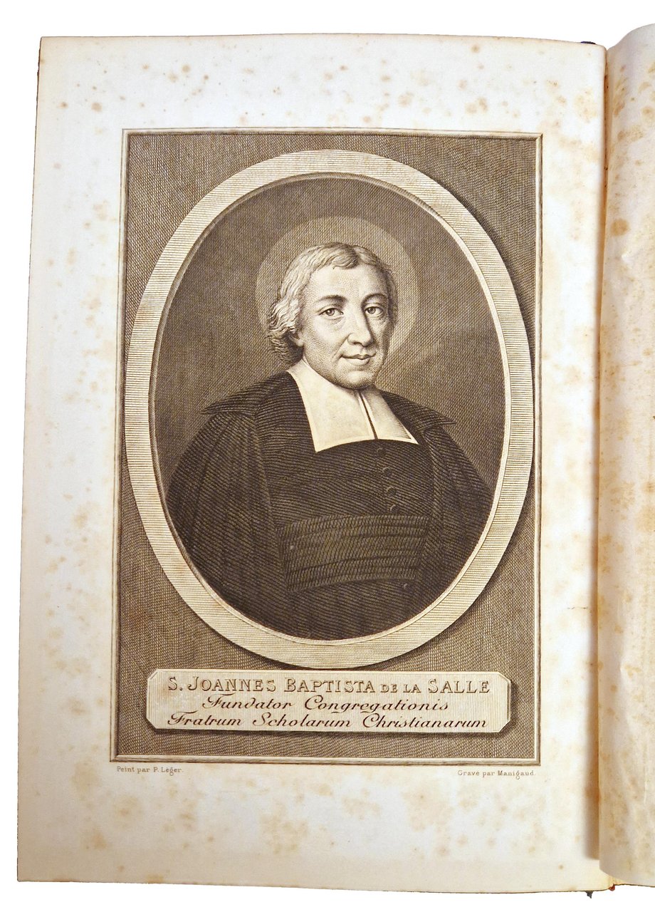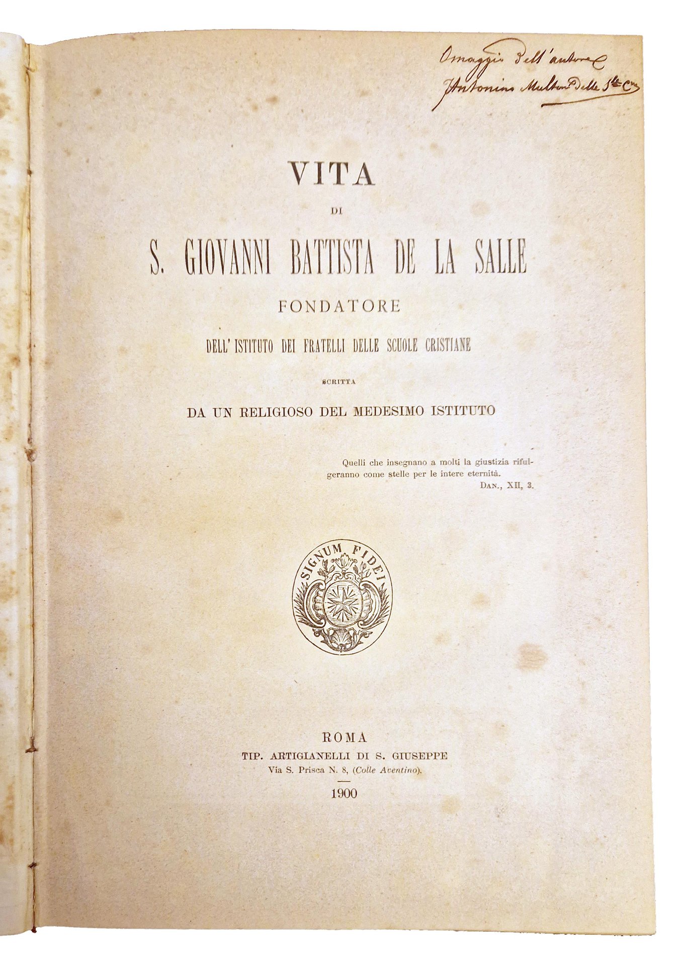 Un volume, dim. 252x180 mm, leg. coeva in pelle verde con preziose impressioni ai piatti e al dorso, decori dorati e titolo in oro al dorso, sguardie marmorizzate; pp. XXIII, (1 b.), 486, (1) c. di tav. Antiporta con ritratto di S. Giovanni Battista De La Salle, disegnato da P. Leger e inciso da Manigaud. Iniziali, fregi e testatine finemente incise. Seconda edizione (la prima è del 1888) di questa interessante e vasta biografia. Prov.: Iscizione manoscritta a penna nera in alto a destra al frontespizio ("Omaggio dell'autore Antonino Multon [?] dell Sorelle Cristiane"); altra iscrizione manoscritta a penna rossa ad una guardia libera anteriore (Giulio Baldo). Rif.: IT\ICCU\TO0\1222393. OCLC, 797569155. Cond.: Leggere tracce d'uso alla bella legatura (lievi abrasioni alle cuffie e brunitura al dorso). Vecchio restauro al margine esterno della p. 53. carte pulite, con presenza di sottolineature di studio a parti del testo ad inchiostro rosso. Esemplare in condizione generali molto buone, con una bellissima legatura.