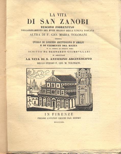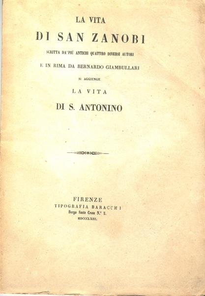 Baracchi, Firenze, 1863. Si aggiunge la Vita di S. Antonino. Formato 24x16,5, brossura originale con cop. cartoncino grigio, pagg. 48 più indici 4, intonso. Due stupende incisioni uguali a inizio e fine libro (vedi foto alla presente scheda). OTTIMO stato