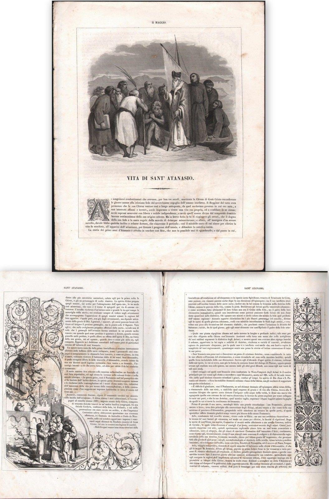 VITA DI SANT'ATANASIO. AUTORE A.DENYS OPUSCOLO DI PP. 8 TRATTO DA. VITE DE SANTI-PARIGI 1863 CM.29 X 22,5 INCISIONE IN ACCIAIO ALLA PRIMA PAGINA E BELLISSIME XILOGRAFIE ALL'INTERNO. L1425 ALCUNE FIORITURE E MACCHIE CHE NON PREGIUDICANO LA LETTURA. MARGINE SINISTRO IRREGOLARE,