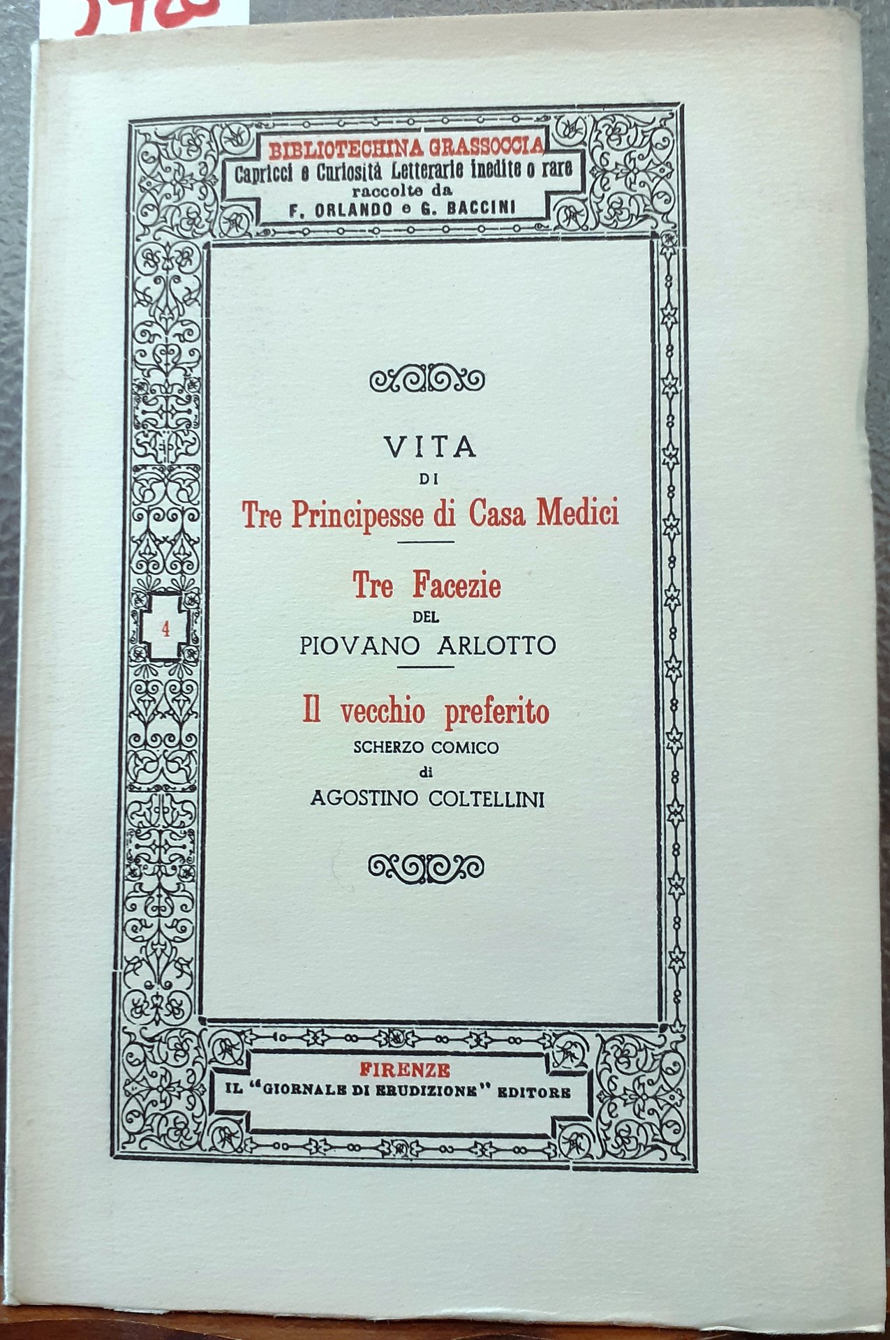 VITA DI TRE PRINCIPESSE DI CASA MEDICI - TRE FACEZIE DEL PIOVANO ARLOTTO - IL VECCHIO PREFERITO SCHERZO COMICO DI AGOSTINO COLTELLINI.