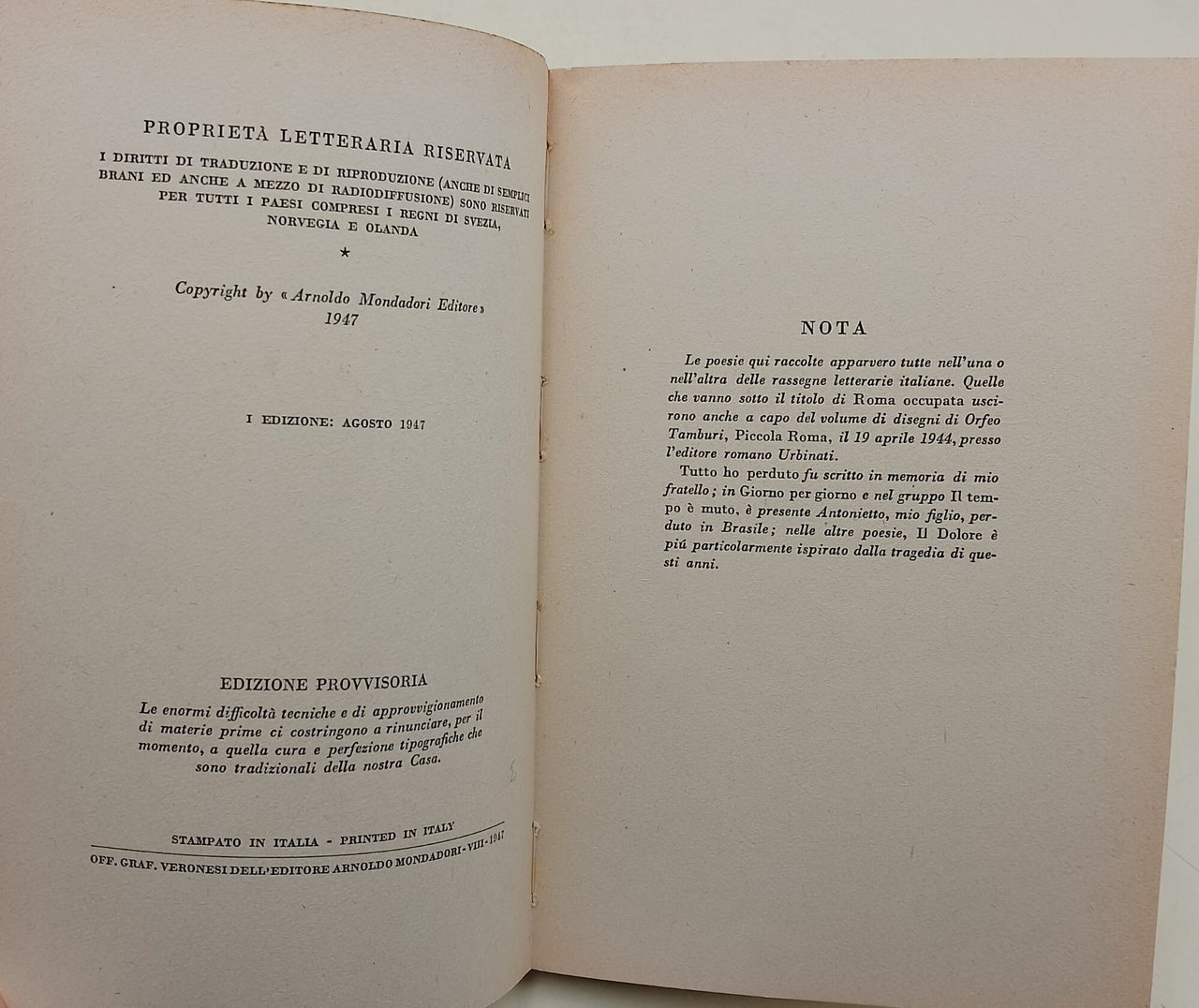 In 8', br. ed. con risv., e velina, pp. 72, prima edizione; breve dedica al frontespizio, complessivamente in buono stato, ordinari segni del tempo. ***Due to bureaucratic reasons, books dated over 70 years old cannot be immediately exported, please contact us before placing the order.***