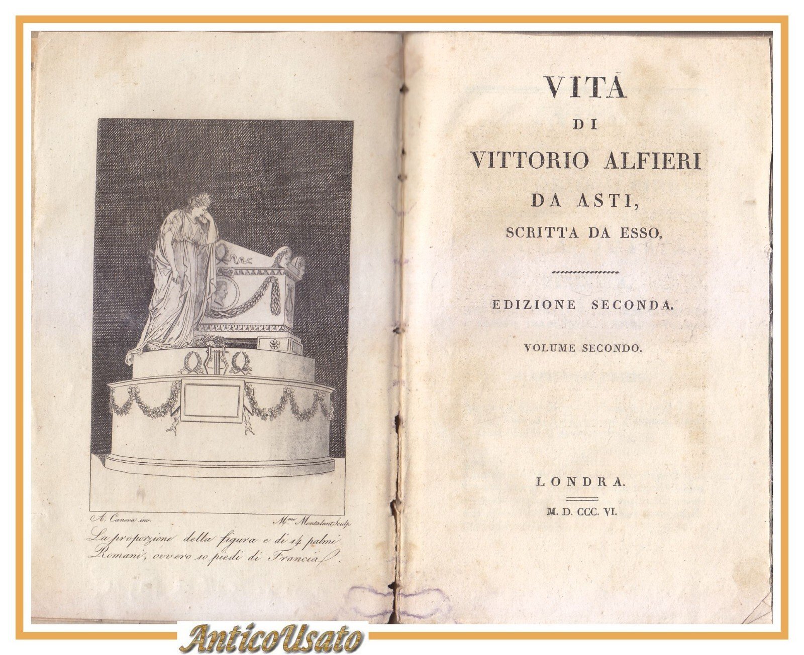 224 pagine, antiporta calcografico sottoscritto Antonio Canova e Mme Montalant. copertina non editoriale in cartone rigido. stato di conservazione: accettabile (da collazione con esemplare in SBN sembrano mancare le ultime 5 pagine, forse di indice. gora d'umido al margine interno soprattutto nelle prime e ultime pagine, legatura appena allentata, mancanze e scritta a matita all'occhietto, fettuccia all'ultima pagina)