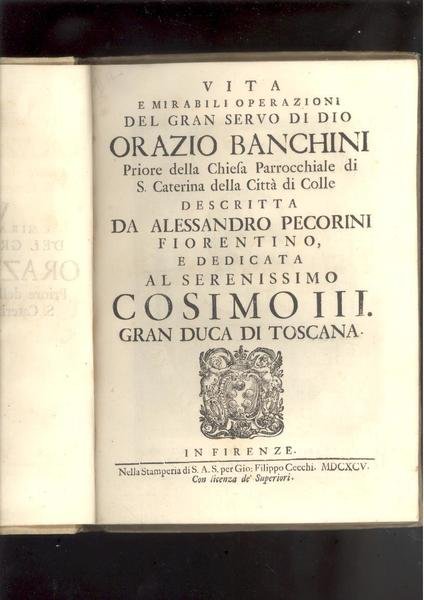 VITA E MIRABILI OPERAZIONI DEL GRAN SERVO DI DIO ORAZIO BIANCHINI PRIORE DELLA<BR>CHIESA PARROCCHIALE DI S. CATERINA DELLA CITTA' DI COLLE DESCRITTA DA ALESSANDRO PECORINI FIORENTINO, E DEDICATA AL SERENISSIMO COSIMO III. GRAN DUCA DI TOSCANA.