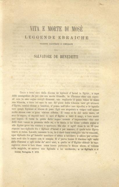 VITA E MORTE DI MOSE'. Leggende ebraiche tradotte, illustrate e comparate da Salvatore De Benedetti. Estratto da "Scienze noologiche", tomo XVII. 1879 circa.