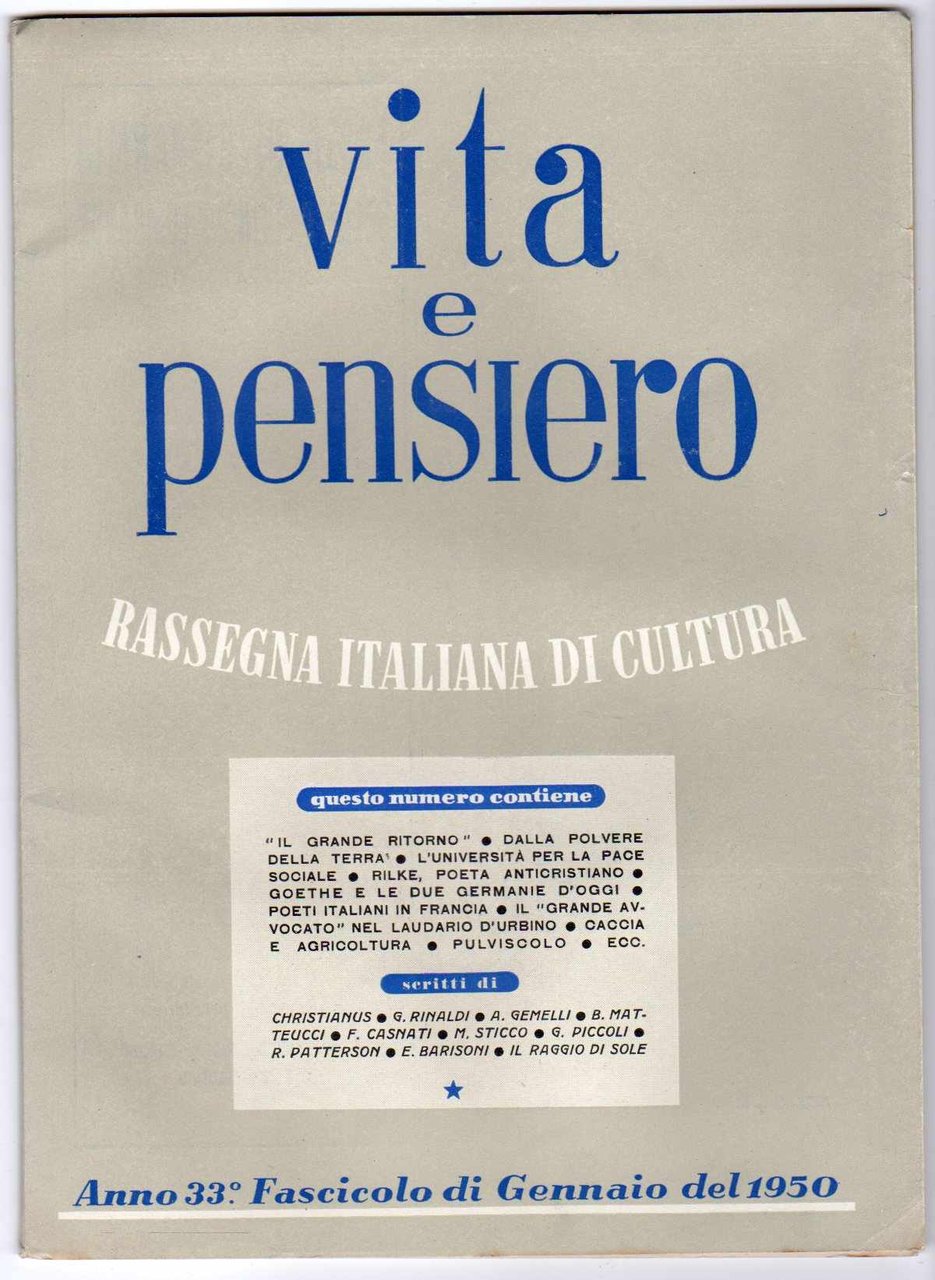 Vita e pensiero rassegna italiana di cultura - Annata 1950 completa dei 12 numeri da Gennaio a Dicembre