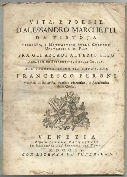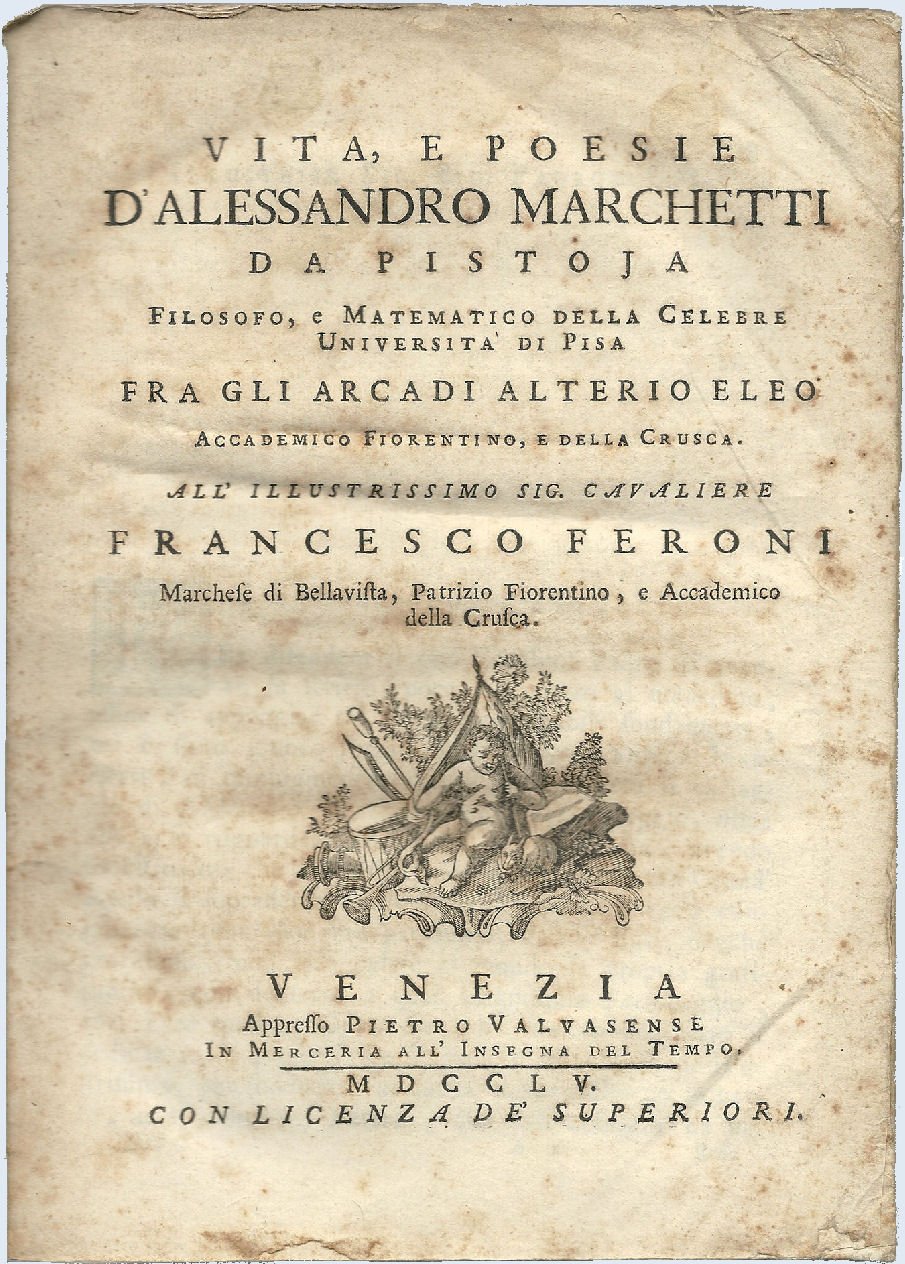 Vita, e poesie d'Alessandro Marchetti da Pistoja filosofo, e matematico della celebre Università di Pisa fra gli arcadi Alterio Eleo accademico fiorentino, e della Crusca.