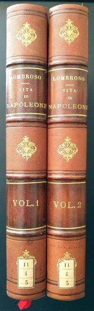 Coi Tipi Borroni e Scotti, 1852. Due volumi in 4to, pp. VII, 624 (con Indice); VII, 1160 (con Indice), al primo vol. antip. incisa in b/n a p. p. con busto in battaglia di Napoleone e scenette laterali, il tutto arricchito da stendardi, aquile e cannoni (Mantovani inc.) e due litografie in b/n f. t.; al secondo volume antip. incisa in b/n a p. p. con ritratto di Napoleone circondato in ovale da drappi e fronde di alloro e sormontato dall'aquila, nella parte inferiore un campo di battaglia (N. Maurin inv. Gaet.o Bonatti inc.) e molte litografie in b/n f. t. tra cui un bel ritratto di Napoleone Primo Console, testo inquadrato da doppio filetto tipografico, solide ed eleganti leg. con dorsi in pelle e titoli in oro, piatti in cartonato marmorizz., nastri di lettura in rosso. Opera completa in due volumi che comprendono prima e seconda parte. Il secondo volume presenta sporadiche macchiette di foxing ma nell'insieme trattasi di esemplari in splendido stato di conservazione.