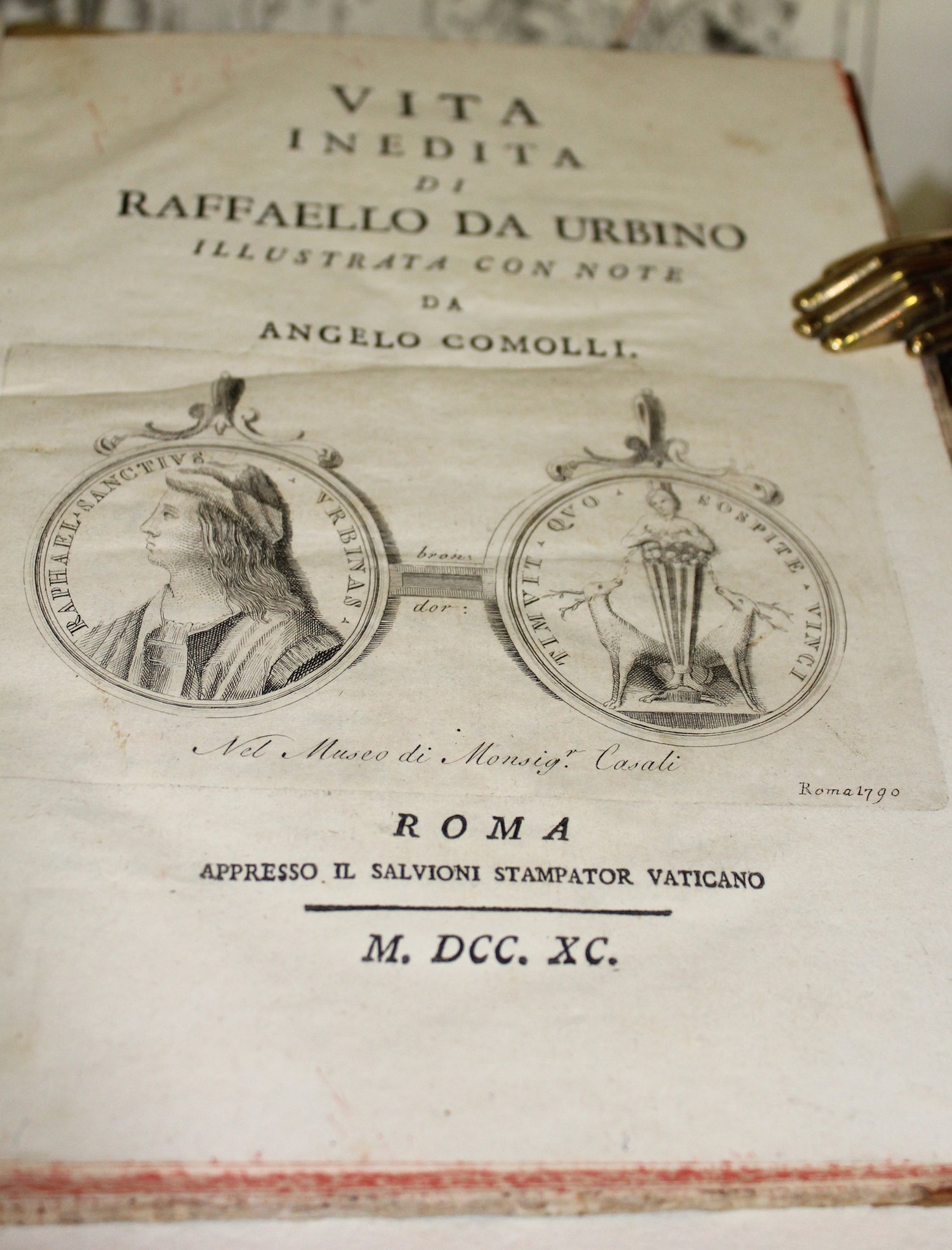 In 4° (mm. 267x202); pagg. (2), IV, 100. Mezza pelle coeva con angoli, tassello con titolo impresso in oro al dorso, cartone decorato con motivi floreali ai piatti. Taglio a chiazze rosse. Bell'immagine calcografica al frontespizio raffigurante una medaglia con ritratto del pittore. Nella nota seguente l'avviso Agli eruditi Amatori l'editore avverte che la "vita, o sia elogio dell'immortale Raffaello corredato di erudite note" fu rinvenuto in un codice del XVI e che può essere attribuito a Giovio o a Della Casa. <BR>Prima edizione<BR>Buon esemplare, molto marginoso, a parte una leggera spellatura e qualche piccolo foro di tarlo al dorso. <BR>Cicognara 2241<BR>