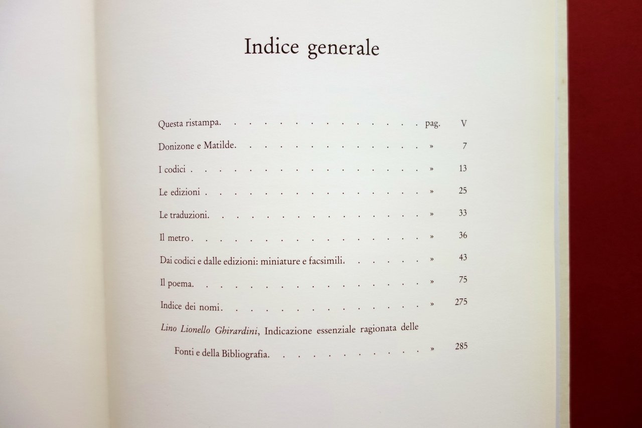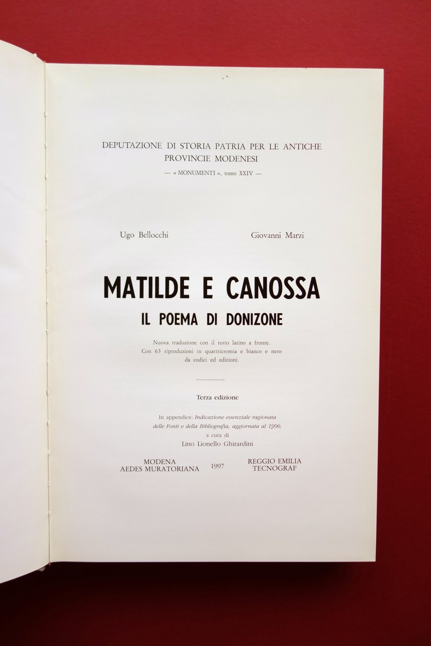 Ugo Bellocchi - Giovanni Marzi, Matilde e Canossa il poema di Donizone nuova traduzione con il testo latino a fronte con 63 riproduzioni in quattricromia e bianco e nero da codici ed edizioni terza edizione in appendice: indicazione essenziale ragionata delle fonti e della bibliografia, aggiornata al 1996", a cura di Lino Lionello Ghirardini Aedes Muratoriana - Tecnograf, Modena - Reggio Emilia 1997; cm 31,l5x21,5; pp. VIII-308 con 63 ill. in b/n e a colori fuori t.; tutto cartonato ed. ill. a colori. Testo originale latino a fronte. Condizioni di conservazione Buone condizioni con leggere tracce di utilizzo, coperta e taglio superiore con alcune minime lievi bruniture e accenni di sporco. Interni ottimi, freschi. Edizione integrale della "Vita Mathildis", con testo originale latino a fronte. SETT209.L23792 N "