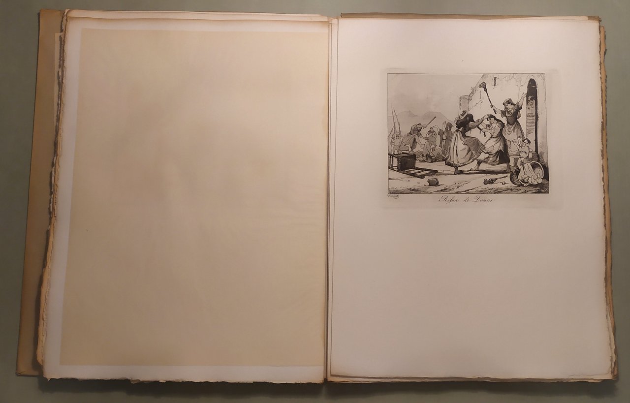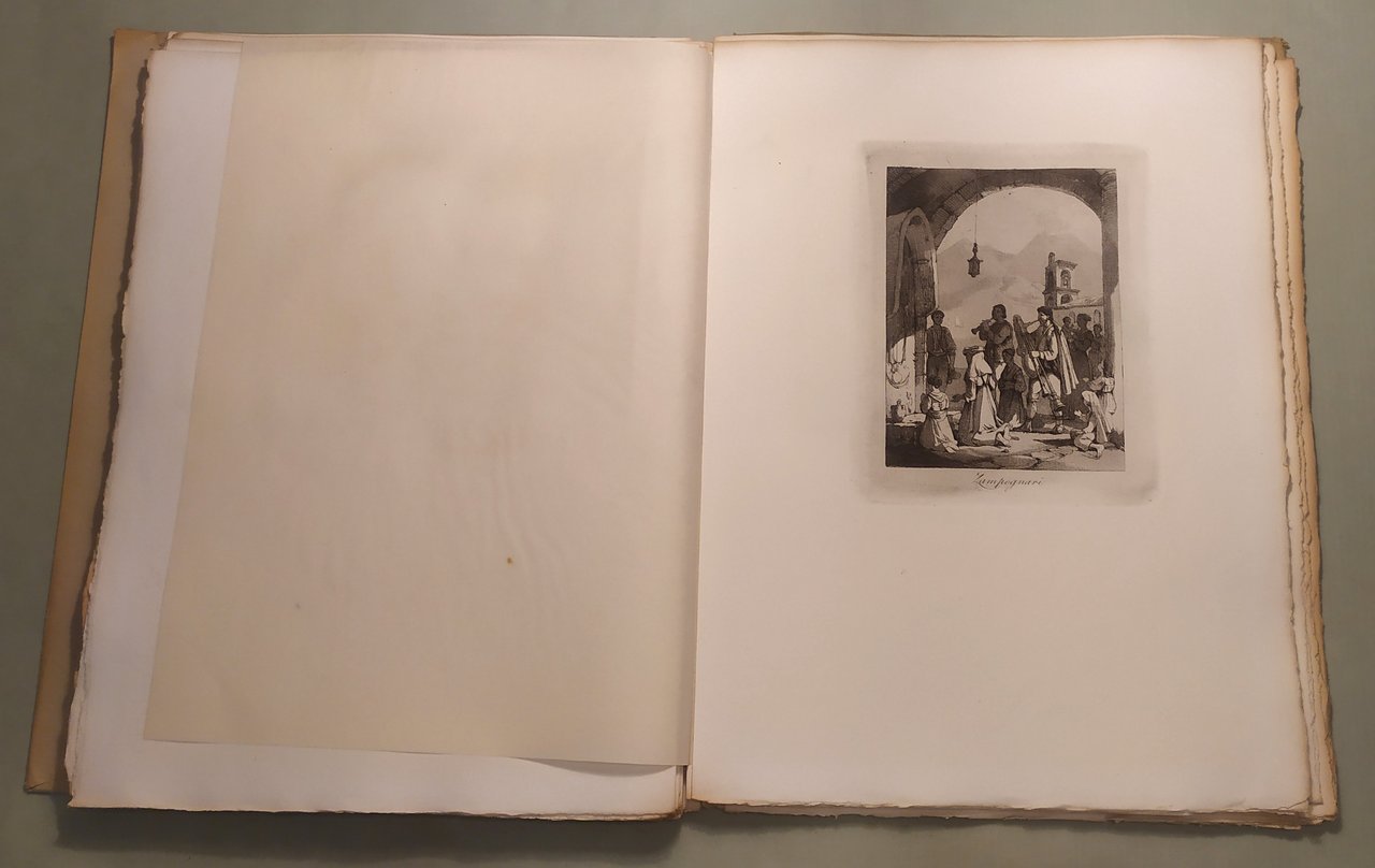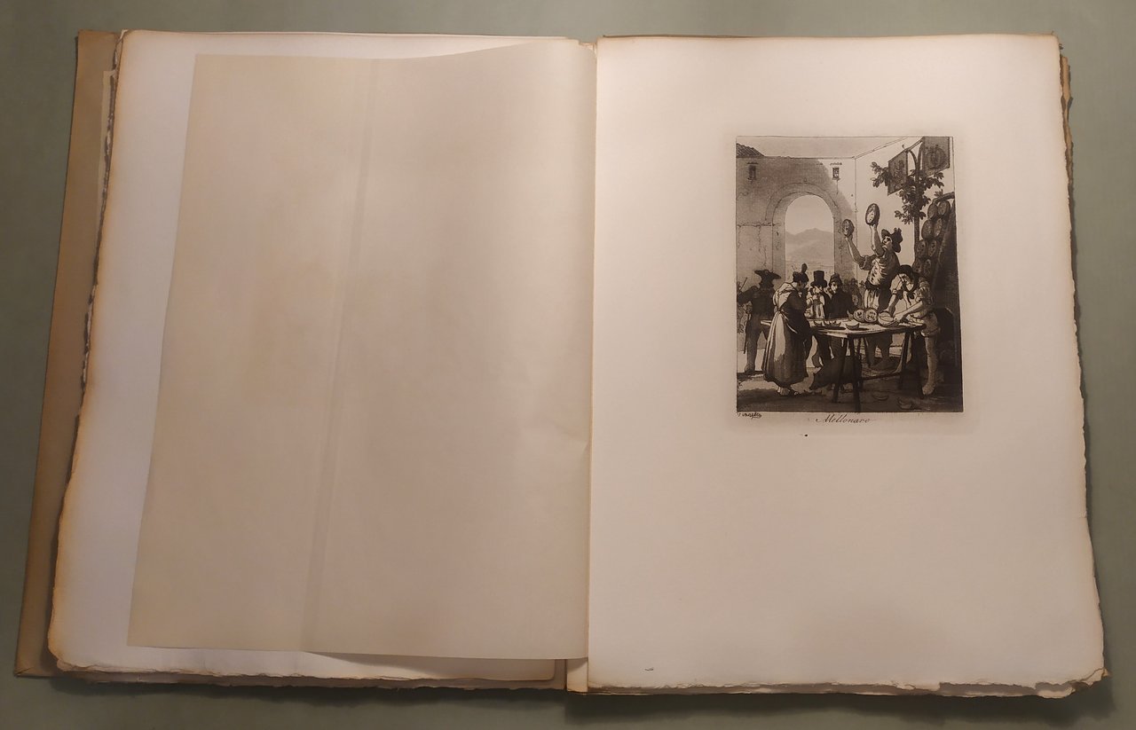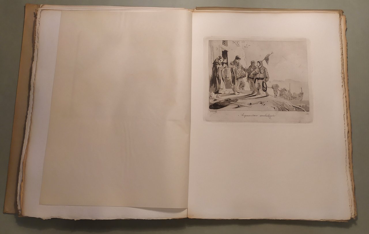 Napoli, L’Arte Tipografica, 1955. In 8vo; pp.25,1n.n. di testo. Custodia editoriale. Sontuosa edizione su carta a mano a fogli sciolti, intonsi con testimoni. Lo squisito testo, ricco di note, aneddoti, curiosità patrie, compendia la storia di quest’opera rarissima ripubblicata in occasione del ritrovamento di trentaquattro dei trentasei rami originali nel Museo di San Martino. Questa tiratura dei rami originali di Achille Vianelli, eseguita nel maggio 1955, e che non sarà più riprodotta, si compone di 25 esemplari numerati e di altri 25 fuori commercio al nome. Esemplare n. 13.