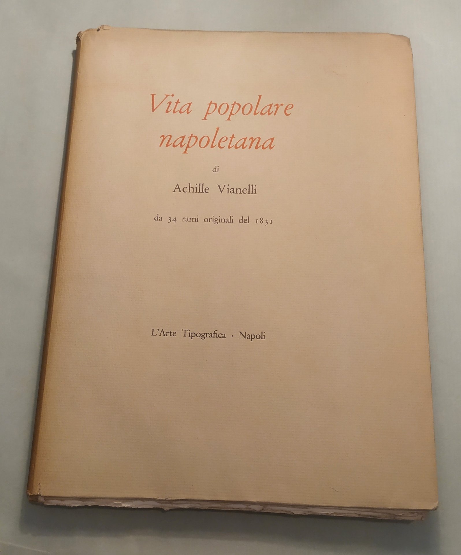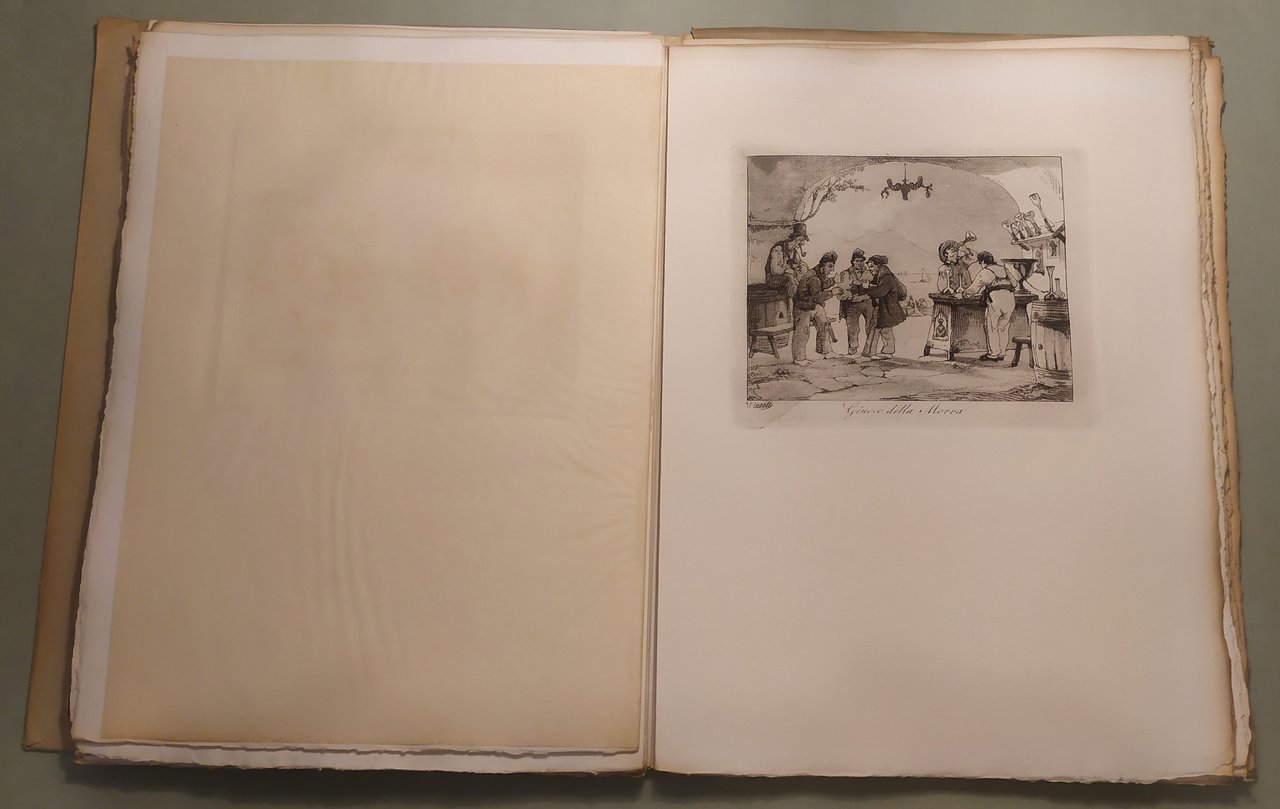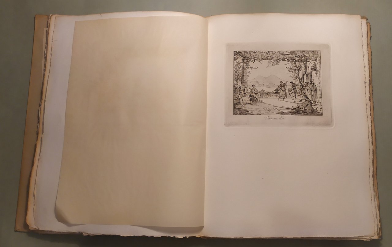 Napoli, L’Arte Tipografica, 1955. In 8vo; pp.25,1n.n. di testo. Custodia editoriale. Sontuosa edizione su carta a mano a fogli sciolti, intonsi con testimoni. Lo squisito testo, ricco di note, aneddoti, curiosità patrie, compendia la storia di quest’opera rarissima ripubblicata in occasione del ritrovamento di trentaquattro dei trentasei rami originali nel Museo di San Martino. Questa tiratura dei rami originali di Achille Vianelli, eseguita nel maggio 1955, e che non sarà più riprodotta, si compone di 25 esemplari numerati e di altri 25 fuori commercio al nome. Esemplare n. 13.