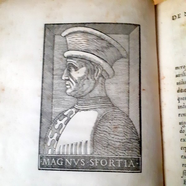 In-4 ; pp. (8), XLVIII, (6), 1 cb; bel ritratto inciso su legno di Muzio Attendolo Sforza Magnus Sfortia , all'ultima pagina marca tipografica incisa su legno. Pergamena con due tasselli e titolo in oro al dorso. Al frontespizio timbro a inchiostro di possesso.Opera dedicata al cardinale Ascanio Sforza.Edizione originale della biografia del capostipite della famiglia Sforza, Muzio Attendolo detto Sforza il Grande, figlio di Giovanni Attendoli e Elisa Petroncini. Giovio dedic molta parte della sua riflessione politica al tema della libert di Milano sotto la famiglia Sforza.L'opera narra in 91 capitoli la vita di Muzio Attendolo, il Cotignola, (Cotignola di Ravenna, 1369-Pescara 1424; il melo cotogno entr nello stemma del ramo degli Attendolo Sforza), che ebbe una storia molto avventurosa ed edificante: nacque infatti in una agiata famiglia di agricoltori dove gi alcuni membri erano dediti alla guerra; divenne poi grande condottiero, aprendo la strada al figlio naturale Francesco verso la conquista della signoria di Milano, il primo duca della dinastia Sforza. Il conte Alberico da Balbiano gli diede il glorioso soprannome di Sforza, che dal nome latino richiamava la violenza e l ardire del suo comportamento fin da giovane. Divenne infatti uno dei pi celebrati condottieri del suo tempo, Gonfaloniere della Chiesa per Martino V, gran contestabile del regno di Napoli per la regina Giovanna, che assegn al figlio del Muzio, e da lui in poi a tutti i discendenti, definitivamente il cognome Sforza.Paolo Giovio (Como 1483-1552) stato uno degli intellettuali pi stimati e influenti della prima met del Cinquecento; pass dallo studio della medicina alla vita di gentiluomo nell'ambiente romano della corte di Leone X, divenne medico personale di Giulio de Medici poi papa Clemente VII, sotto il quale Giovio ebbe grande fortuna. Nella sua villa sul lago di Como, decorata con gli affreschi disegnati da Vasari, raccolse la sua celeberrima e variegata collezione, ricca di cimeli e rarit da ogni parte del mondo. La straordinaria galleria di ritratti gli ispir la scrittura di molte biografie, tra cui questa Vita: il ritratto qui inciso su legno infatti tratto da un dipinto che conservava nella sua casa e che sovente ammirava. La xilografia, per la grande somilgianza con il figlio, venne spesso confusa con il primo ritratto del figlio Francesco.Mortimer I, n. 212; Adams G-692; Sander II, 3170; S.T.C. p. 304; Shaaber n. 201; Brunet III, p. 584.In-4 ; pp. (8), XLVIII, (6), 1 cb; beautiful portrait engraved on wood of Muzio Attandolo Sforza Magnus Sfortia , on the last page a printer s mark engraved on wood. Vellum with two labels and gilted title on the spine. Ownership ink stamp at the title page.Work dedicated to Cardinal Ascanio Sforza.Original edition of the biography of the founder of the Sforza family, Muzio Attandolo called Sforza the Great, son of Giovanni Attendoli and Elisa Petroncini. Giovio devoted much of his political reflection to the theme of Milan's freedom under the Sforza family.The work narrates in 91 chapters the life of Muzio Attendolo, the Cotignola, (Cotignola di Ravenna, 1369-Pescara 1424; the quince entered the coat of arms of the Attendere Sforza), who had a very adventurous life: he was born in a wealthy family of farmers whose members were already devoted to war; he then became a great leader, opening the way for his natural son Francesco to conquer the lordship of Milan, the first duke of the Sforza dynasty.Count Alberico da Balbiano gave him the glorious nickname of Sforza, which from the Latin name recalled the violence and daring of his behavior from a young age. In fact, he became one of the most celebrated leaders of his time, Gonfaloniere of the Church for Martin V, great constable of the Kingdom of Naples for Queen Giovanna, who assigned the surname Sforza to the son of Muzio, and from him onwards to all descendants. .Paolo Giovio (Como 1483-1552) was one of the most esteemed and influential intellectuals of the first half of the sixteenth century; he turned from the study of medicine to the life of a gentleman in the Roman environment of the court of Leo X, became the personal doctor of Giulio de Medici then Pope Clement VII, under whom Giovio had great fortune. In his villa on Lake Como, decorated with the frescoes designed by Vasari, he collected his famous and varied collection, rich in relics and rarities from all over the world. The extraordinary gallery of portraits inspired him to write many biographies, including this Life: the portrait engraved on wood here is in fact taken from a painting he kept in his home and which he often admired. The woodcut, due to the great similarity with the son, was often confused with the first portrait of his son Francesco.Mortimer I, b. 212; Adams G-692; Sander II, 3170; S.T.C. p. 304; Shaaber no. 201; Brunet III, p. 584.