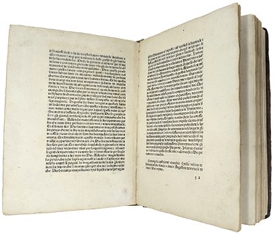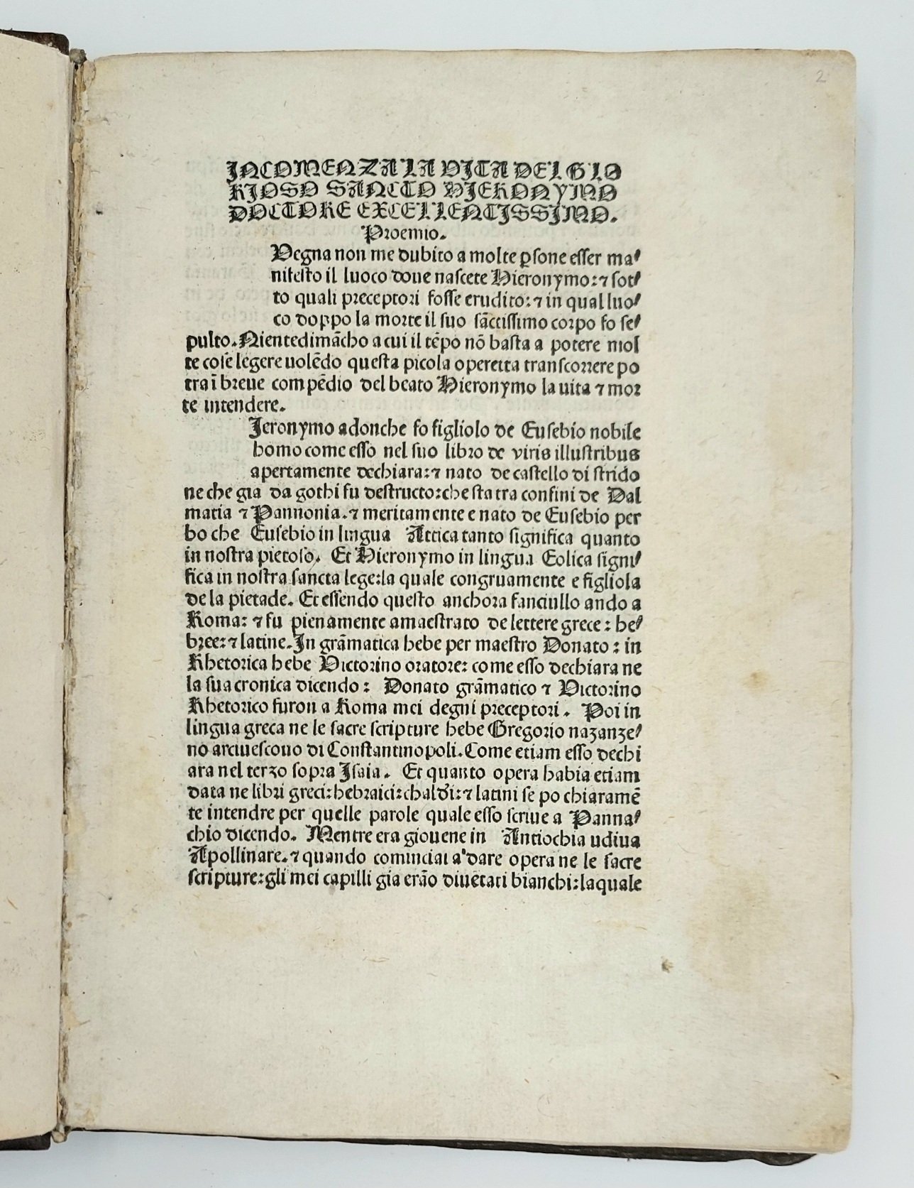 >in-4, (200x142 mm) ff. 85 n.n. (non conservato il primo f. bianco), legatura coeva in pelle su piatti in cartone, i piatti adorni di larga bordure (il dorso rifatto, tarli restaurati ai piatti). Raffinato carattere gotico (81 G), usato qui per la prima volta. Inusuale è il titolo in grandi capitali gotichesu tre linee . Si tratta di un compendio di opere di vari autori dedicate alla vita e alla morte di san Gerolamo; comprende, il tutto in volgarizzamento italiano: Eusebius Cremonensis, ''Epistola de morte Hieronymi''; Aurelius Augustinus, ''Epistola de magnificentiis Hieronymi''; Cyrillus, ''De Miraculis Hieronymi''; ''Certi miracoli''; ''Certi detti dei santi e dottori sopra S. Girolamo''; ''Inno al S. Girolamo''. Si tratta della riedizione della raccolta apparsa nel mese di marzo presso il medesimo stampatore. La prima attività del Manzolo fu quella di maestro cartaio: dopo la metà del secolo l'industria cartaria fu fortemente connessa con la nascente industria tipografica e nel 1475 aprì a Treviso una propria stamperia, pubblicando nel corso di sette anni di attività non meno di 37 edizioni, perlopiù a carattere religioso. Il suo nome apparve su qualche edizione di Vicenza, affiancato a quello del Liechtenstein. Ottimo esemplare a grandi margini, su carta forte. Incunabolo trevigiano assai raro (sono censiti una dozzina di esemplari in collezioni pubbliche). Martini 399. BMC VI, 890. Hain 8644. Goff H253 . IGI 3739 .