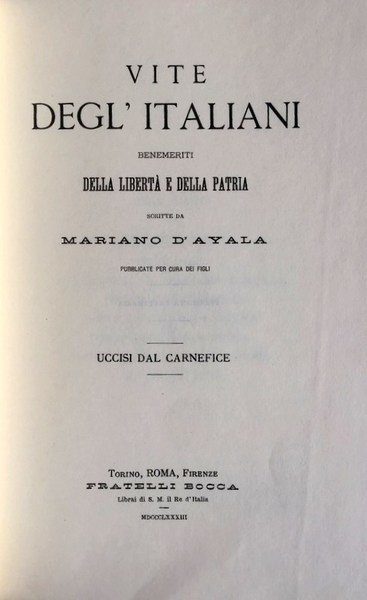 Titolo originale: Vite degl' Italiani benemeriti della libertà e della patria, scritte da Mariano d'Ayala, pubblicate per cura dei figli (Alfredo e Michelangelo). Uccisi dal carnefice. Torino, Roma, Firenze: Fratelli Bocca, 1883