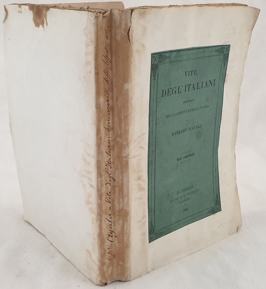 Interessante volume del 1868, un dizionario biografico dei patrioti italiani scritto da Mariano D'Ayala. Per ognuno notizie sulla morte e sulla vita. In buone condizioni. Copertina morbida con brossura editoriale applicata al piatto anteriore in buone condizioni generali con lievi usure ai margini e dorso. Legatura in buone condizioni. Pagine in buone condizioni con fioriture. In 8. Dim. 23,5x15,5 cm. Pp. XIV+(2)+370. Peso Kg. 0,566Interesting volume of 1868, a biographical dictionary of italian patyriots written by Mariano D'Ayala. For reach one information about his life and death. In good conditions. Soft cover wih editorial cover applied on front plate in good general conditions lightly worn in the extremities. Binding in good conditions. Pages are in good conditions with foxing. In 8. Dim. 23,5x15,5 cm. Pp. XIV+(2)+370. Peso Kg. 0,566