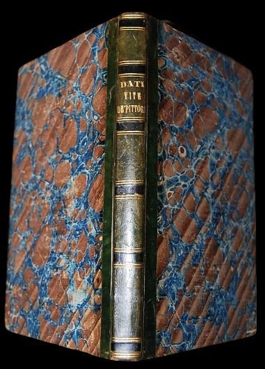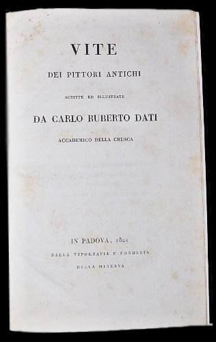 In 8° (21,2×13,5 cm); (4), 270, (2) pp. Bella legatura coeva in mezza pelle verde con titolo e filetti in nero e oro al dorso. Piatti foderati con carta marmorizzata coeva. Belledizione padovana stampata dalla Minerva, di questo classico studio del celebre filologo, scienziato ed accademico fiorentino che fu allievo di Galilei e Torricelli, Carlo Roberto Dati. nel 1667 dedicò a Luigi XIV di Francia Le vite de pittori antichi, unopera nella quale Dati sosteneva la tesi che lartista si forma lidea della bellezza perfetta studiando le figure e gli oggetti naturali, fondendole poi con limmaginazione in una immagine ideale. Lopera, che avrebbe dovuto trasformarsi in un trattato di maggiori dimensioni, non fu tuttavia portata a termine dal Dati.. Lopera è particolarmente interessante in quanto ricostruisce la vita e lopera di alcuni pittori dellantichità quali Zeusi, Parrasio, Apelle, Protegene. Qualche lieve ed ininfluente arrossatura al frontespizio ma nel complesso esemplare in ottime condizioni di conservazione ed in bella legatura. Bibl. rif.: Graesse, II, 337 (nota); Cicognara, n. 2252; Gamba,427.