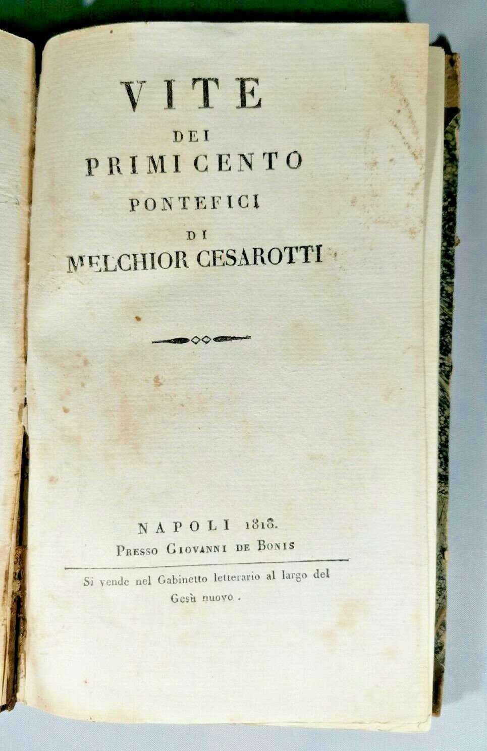 VITE DEI PRIMI CENTO PONTEFICI di Melchiorre Cesarotti. Napoli presso Giovanni De Bonis 1818. 242 pagine. Copertina coeva in mezza pelle con titoli dorati entro tasselli al dorso e piatti marmorizzati. Dimensioni 12,5 x 20 cm. stato di conservazione: molto buono (pagine normalmente ingiallite, poche fioriture, copertina un po’ sciupata)