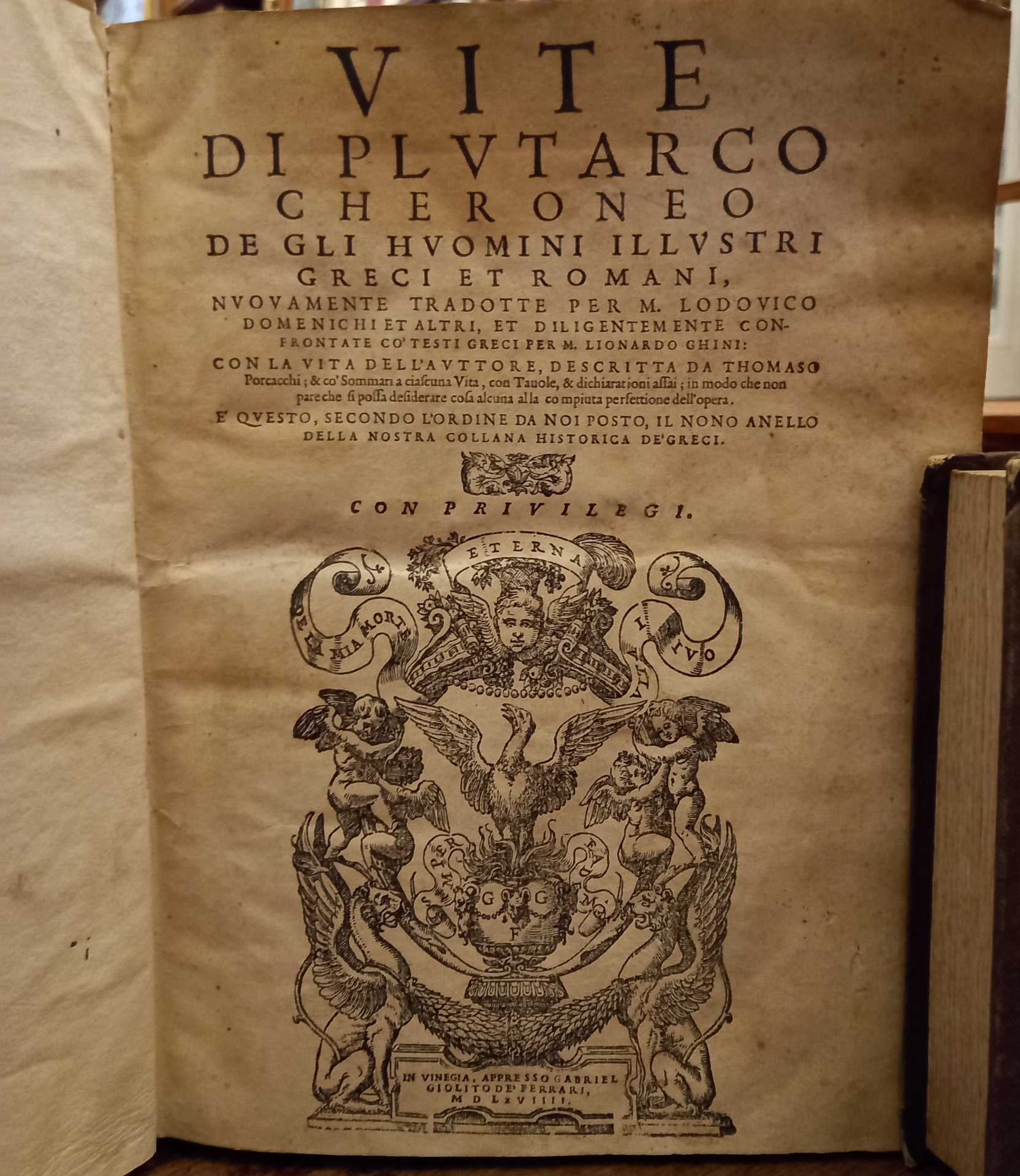 Vite di Plutarco Cheroneo de gli huomini illustri greci et romani. Nuouamente tradotte per M. Lodouico Domenichi & altri. Et diligentemente confrontate co' testi Greci per m. Lionardo Ghini. Con la vita dell'auttore, descritta da Thomaso Porcacchi; e co' Somari a ciascuna vita, con Tavole e dichiartioni assai; in modo che non pare si possa desiderare cosa alcuna alla compiuta perfettione dell'opera. E questo secondo l'ordine da noi posto, il nono anello della nostra collana historica de' greci. (SOLO PRIMA PARTE)