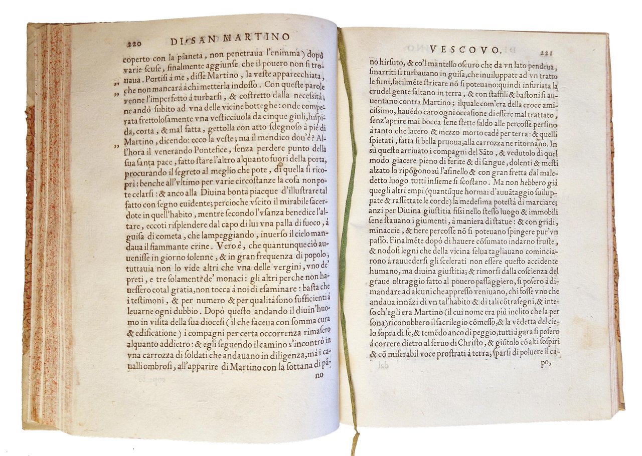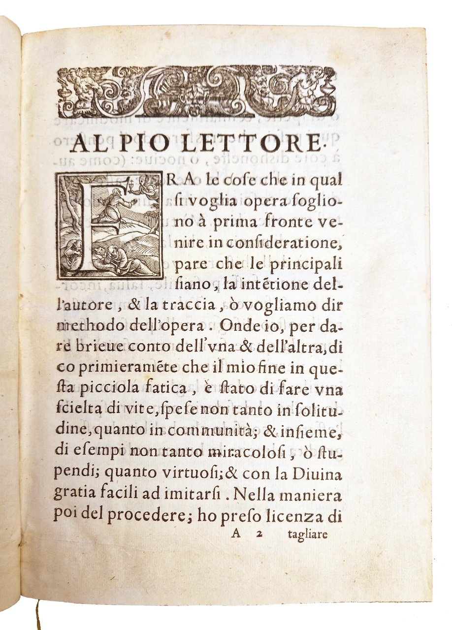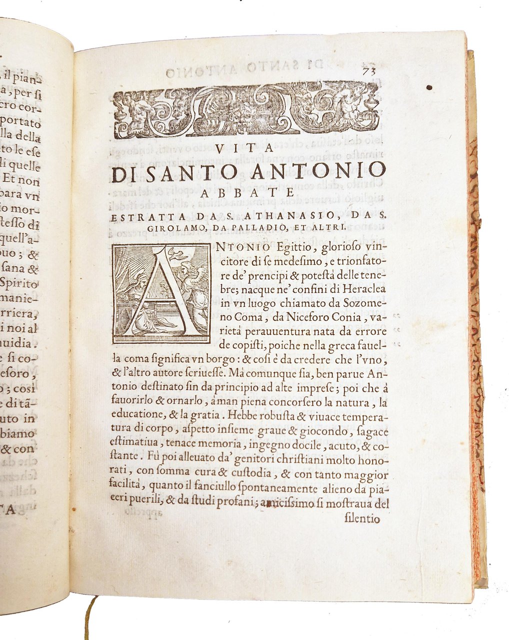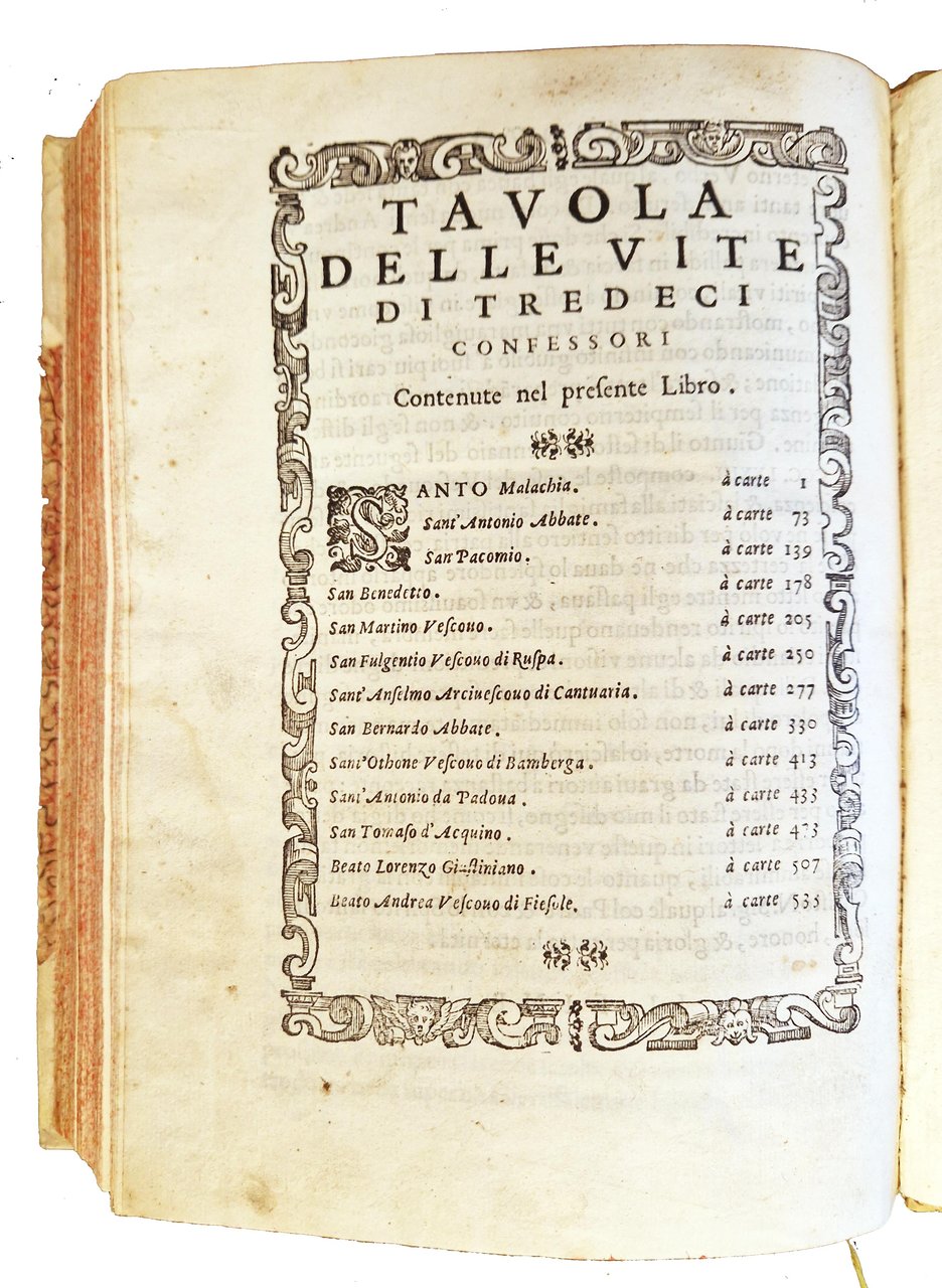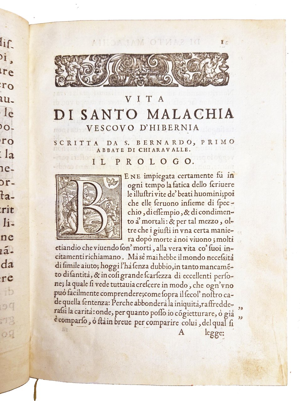 in-4°, 232x166 mm, leg. settecentesca in mezza pergamena con angoli e carta decorata ai piatti, titolo in oro su tassello in pelle rossa al dorso, segnalibro in seta, tagli colorati di rosso a spruzzo; pp. [4], 551, [1]; iniziali e fregi xilografici. Marca sul frontespizio (Monogramma di Cristo [iniziali IHS sormontate da una croce, in basso cuore e chiodi] nell'ostia radiante; in cornice figurata). Prima e unica edizione di questa raccolta di notizie biografiche a cura a cura del padre gesuita Giovanni Pietro Maffei (1533-1603), con le vite di: San Malachia, Sant'Antonio abate, San Pacomio, San Benedetto, Sal Martino vescovo, San Fulgenzio vescovo di Ruspa, Sant'Anselmo arcivescovo di Cantuaria, San Bernardo abate, Sant'Othone vescovo di Maberga, Sant'Antonio da Padova, San Tommaso d'Aquino, beato Lorenzo Giustiniano, beato Andrea vescovo di Fiesole. Rif.: IT\ICCU\BVEE\005578. CNCE 30354. OCLC, 651356946. Cond.: Leggere tracce d'uso alla legatura (abrasionie piccole macanze alla carta dei piatti). Carte croccanti e abbastanza pulite, con rare parziali bruniture. Esemplare decisamente molto buono.