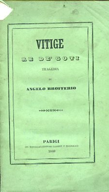 In-16°, pp. 69, (5), brossura originale verde con titolo entro filetti. Vignetta con maschera tragica al titolo. Antiporta litografica incisa da Doyen da invenzione di Gandolfi con raffigurazione di una scena del dramma di Brofferio. Fioriture. Piccoli restauri alla brossura. Una firma del tempo. Buon esemplare. Prima edizione. Precede l'argomento della tragedia, tratto da un brano delle 'Rivoluzioni d'Italia' del Denina. 'La spigliata vivacità delle prose del Messaggiere (raccolte dallo stesso Brofferio in due volumi, nel 1839, preceduti da un primo saggio autobiografico su Come sono diventato giornalista) fece spicco nell'atmosfera sonnolenta e conformista del tempo. Il sovrano, benevolmente disposto verso tutti i fermenti intellettuali del regno, procurò di non far troppo pesare le limitazioni della censura sulle intemperanze dello scrittore e giunse addirittura a suggerirgli, nel quadro dei mutati indirizzi della propria politica estera, la composizione di una nuova tragedia d'argomento italiano. Secondo l'andazzo segnato dalla foscoliana Ricciarda, che proprio in quell'epoca aveva conosciuto la sua massima fortuna editoriale, la trama fu ambientata nei secoli delle dominazioni barbariche: ma Vitige re de' Goti, già allestito dalla Compagnia reale per la rappresentazione, fu vietato all'ultimo momento per sopraggiunte considerazioni di riguardo all'Austria e, già stampato, venne messo in circolazione con la falsa data di Parigi (1840).' (Enzo Bottasso in D.B.I., XIV, 1972).
