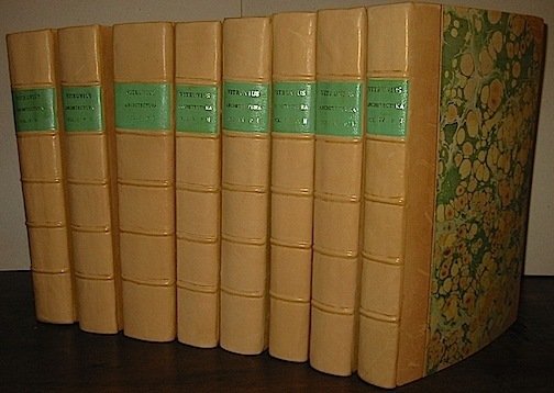 4to (cm. 33), 8 Voll. con 143 tavv. f.t. di cui un ritratto e una tabella rip. Opera completa: collazione conforme alle schede editoriali. Ottime, recenti, legature in mz. pelle bionda con angoli, nervi al ds. e tasselli verdi con titoli oro. Piatti in carta marmorizzata policroma. Conservate in fine ad ogni vol. le brossure editoriali. Bellissimo esemplare in barbe. Riccardi I, 620 ‘grandiosa opera’. Brunet V, 1328 ‘Cette édition, la plus complète et l’une des plus belles qui l’ont ait données de Vitruve, est le fruit des longues recherches.’
