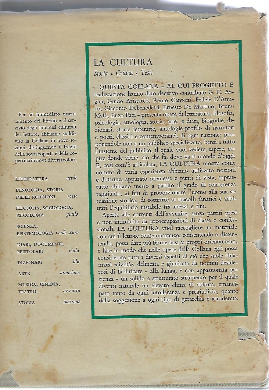 Sovraccoperta con macchie, strappi, pezzi mancanti e tracce d'uso.