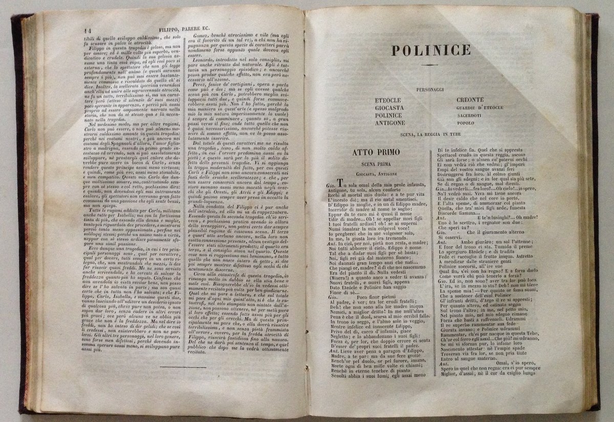Vittorio Alfieri, Vita e Tragedie Teatro tragico completo preceduto dalla vita scritta dall'autore Per Antonio Arzione e C, Milano, 1850; cm. 22,5x15,5; pp. 342; ritratto in antiporta; cartonato ed. rilegato m. pelle con titoli al dorso. Condizioni di conservazione Volume in buone condizioni di conservazione con leggere tracce d'uso e del tempo; piatti e dorso con leggere abrasioni; interni buoni, qualche pagina con traccia di piega all'angolo superiore, margine inferiore dell'ultima pagina con un piccolo disegno fatto a matita colorata che non lede il testo. SETT196.L16795 MT