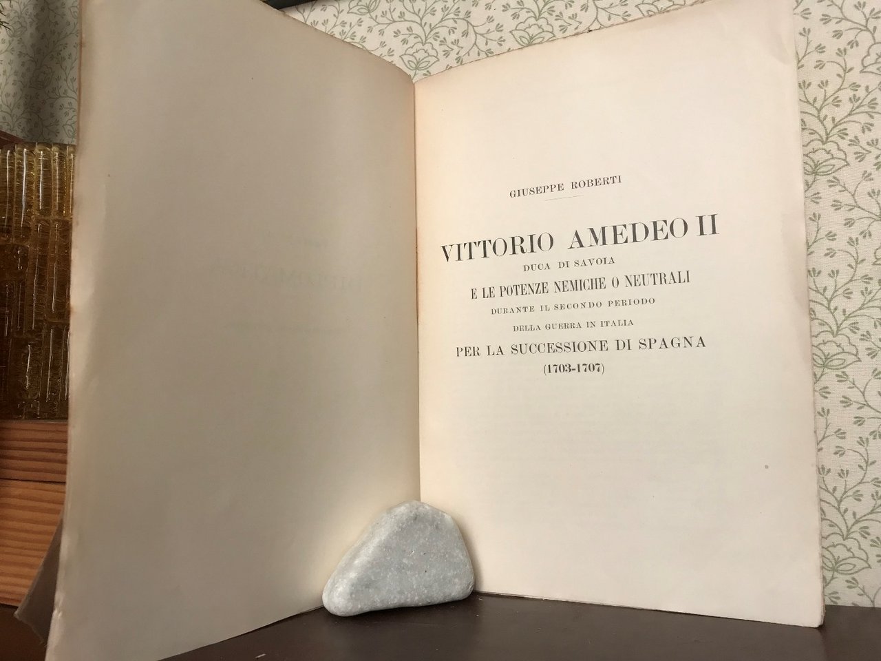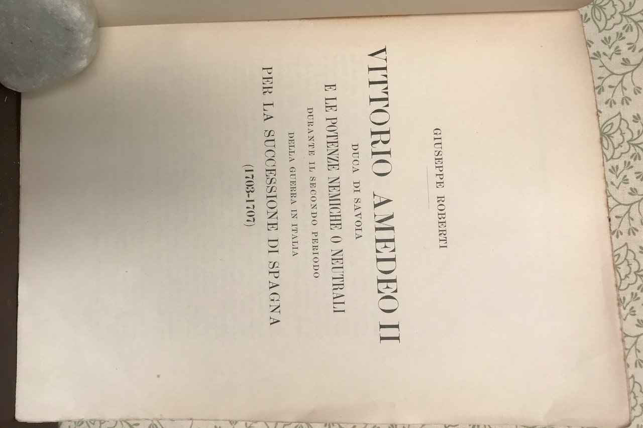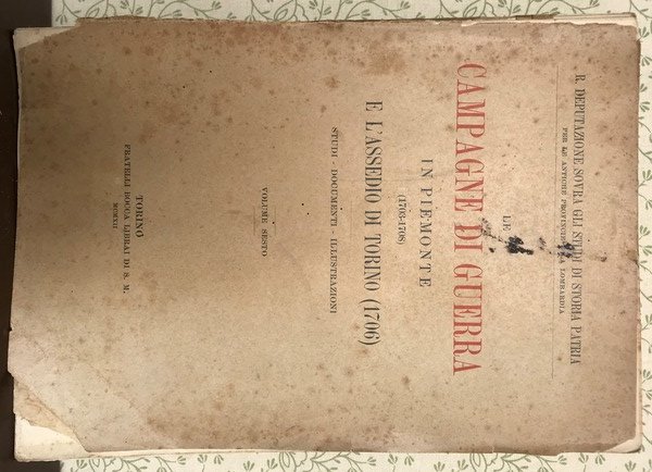 Volume in 4, brossura editoriale (piatto anteriore slegato), titolo al piatto ed al dorso, sguardie, frontespizio generale dellopera, occhiello, Titolo del volume, introduzione, XV (1) 541 (3) pp. Volume VI (completo in se stesso) di Le Campagne di Guerra in Piemonte (1703-1708) e lassedio di Torino (1706), pubblicata per cura della Regia Deputazione sovra gli Studi di Storia Patria (l'opera, collettanea, fu edita in complessivi 8 volumi, l'ultimo dei quali vide la luce solo nel 1933). Importante ed ampia trattazione sui negoziati diplomatici della Corte Sabauda durante la guerra in Italia per la successione di Spagna, fondamentale per una ricostruzione di questo pregnante periodo storico in un Italia sconvolta dalle guerre e in una Torino assediata. Ricchissimo di note e documenti inediti. Questa parte diplomatica comprende anche il contributo di Arturo Segre sui Negoziati della Corte Sabauda colla Corte di Baviera e della Corte di Prussia colla Dieta di Ratisbona; ed il contributo di Pompeo Valente per le relazioni diplomatiche di Vittorio Amedeo II coi Cantoni Svizzeri e con la Repubblica del Vallese. Volume intonso ma parzialmente slegato, esente da mende o fioriture. Raro ed importante.