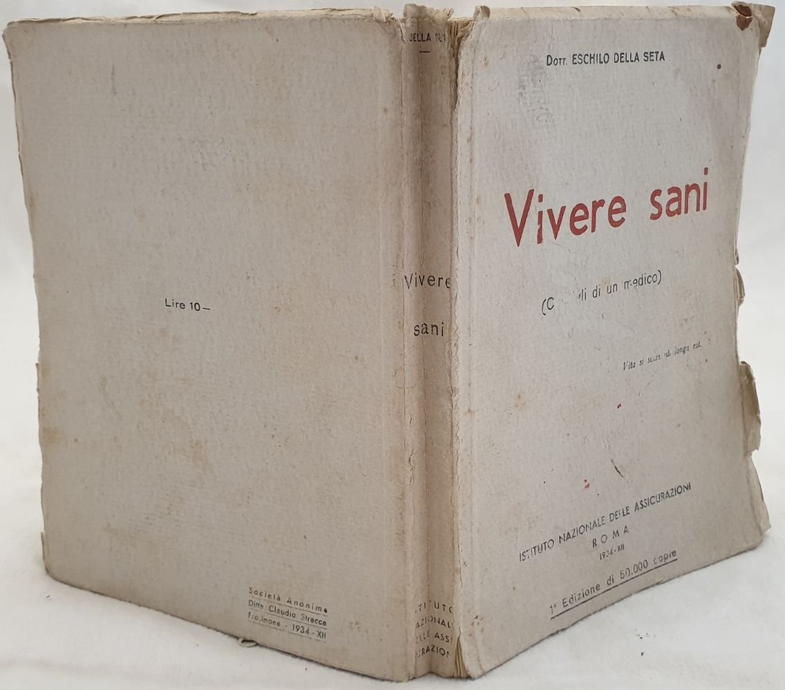 Edizione del 1934 di questo volume di medicina domestica del Dott. Eschilo della Seta edito dall'Istituto Nazionale delle Assicurazioni. All'interno: Igiene preventiva, Per mantenersi giovani e sani (l'igiene non è un sacrificio, igiene preventiva, aspetto esteriore, una buona dentatura, il peso del corpo e la durata della vita, igiene del vestiario), L'igiene nella vita e nel lavoro (Cultura fisica e sports, vacanze), Bacco tabacco e venere (Si puo bere il vino, Cocktails birra caffe e te, il fumo, le sostanze stupefacenti, Igiene della vita sessuale), Medicina preventiva (Sorvegliatre il vostro cuore per prevenirne le malattie, tumori maligni, tubercolosi, malattie del ricambio e apparato urinario, Altri malanni , segnali di allarme, La salute della donna ecc. Alla fine appendice: provvidenze sanitarie a favore degli assicurati. In buone condizioni. Copertina editoriale in discrete condizioni generali con usure e mancanze marginali. Legatura in discrete condizioni con lievi rotture. Pagine in buone condizioni con rare fioriture. In 8. cm 21,5x16,5. Pp. 303+(1) Edition of 1934 of this volume of home medicine by Dott. Eschilo della Seta edited by Istituto Nazionale delle Assicurazioni. Inside: preventive hygiene, to maintain young and healthy Cleaning in life and work Tobacco and wine Cocktails, beer coffee and tea, drugs), Preventive medicine, deseases of women ecc. Appendix at the end: health insurance in favour of insured people. In good conditions. Editorial cover in fair conditions lightly worn in the extremities. Binding in fair condition with light cracks. Pages in good conditions with occasional foxing. In 8. cm 21,5x16,5. Pp. 303+(1)<BR><BR>