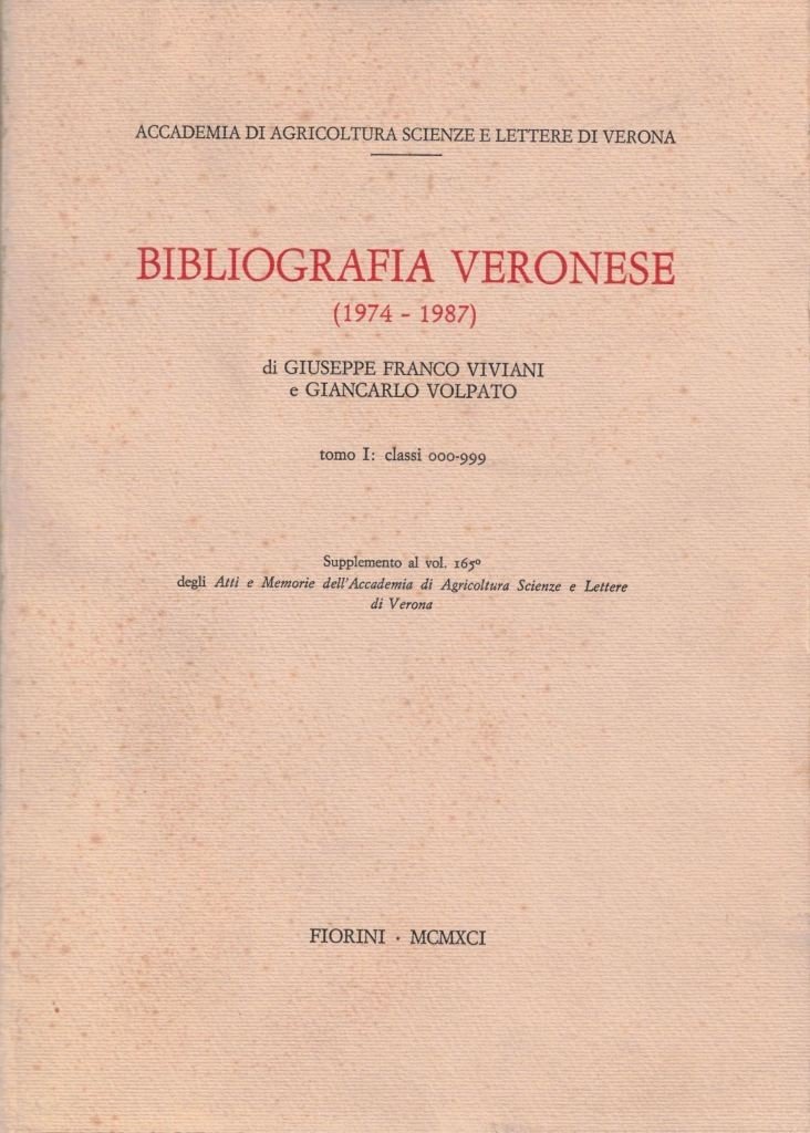 Giuseppe Franco Viviani, Giancarlo Volpato, Bibliografia veronese (1974-1987). Tomo I: Classi 000-999, Fiorini, s.l. 1991, pp. 718, cm 24, br. ed. Collana Bibliografia Veronese, vol. 3. In testa al frontespizio: Accademia di Agricoltura Scienze e Lettere di Verona. Supplemento al vol. 165 degli Atti e Memorie dell’Accademia di Agricoltura Scienze e Lettere di Verona. Leggere tracce d’uso, una macchiolina al taglio, minime fioriture, lieve ingiallitura ai tagli, per il resto ben conservato.