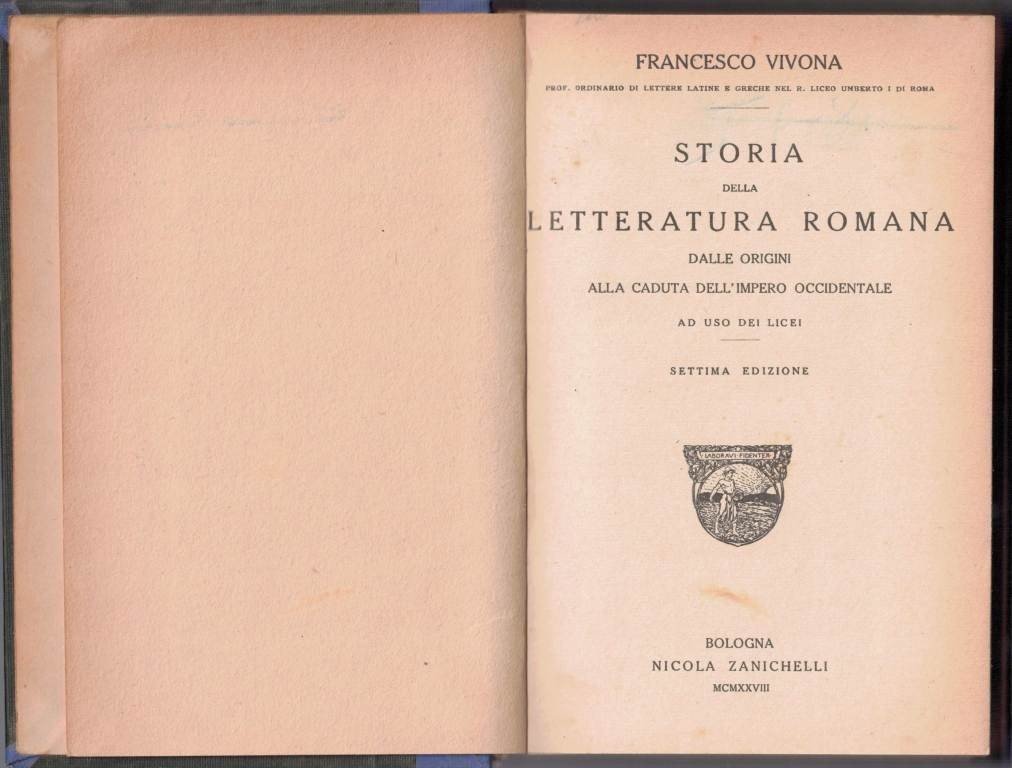Francesco Vivona, Storia della letteratura romana. Dalle origini alla caduta dell’Impero Occidentale. Ad uso dei licei, Nicola Zanichelli, Bologna 1928, settima ed., pp. X, 283, cm 18, legatura coeva in mezza tela blu con titoli in oro al dorso e angoli. In calce a una delle carte interne, firma d’appartenenza, luogo e data. Minime tracce d’uso alla legatura, lievi fioriture ai tagli, tenue brunitura della carta, per il resto bell’esemplare.