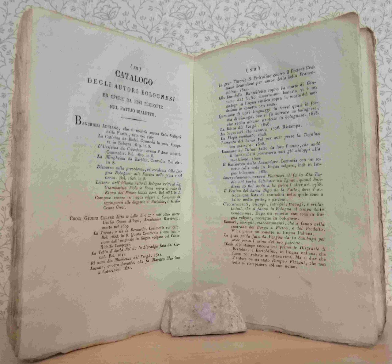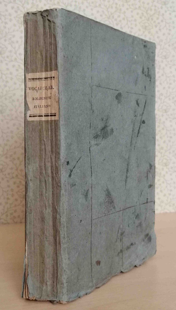 Volume in 8 grande (cm. 22,5 x 15), brossura coeva azzurra, titolo stampato al tassello al dorso, frontespizio, dedicatoria, prefazione, (6), XVIII, 313, (7) pp., bianca finale. Assai apprezzato vocabolario del dialetto bolognese, accurato e per quanto possibile completo, arricchito inoltre da un Catalogo degli autori bolognesi ed opere da essi prodotte nel patrio dialetto interessante ed utilissimo riferimento bibliografico. Sempre molto rari e ricercati i vocabolari dialettali, in particolare questo che si presenta un raro esemplare di uno dei pi celebri vocabolari bolognesi, in prima edizione, stampato a grandi margini su bella carta forte, chiara e pulita, ancora in barbe. In pi che buono stato, con solo qualche traccia di polvere. Importante.