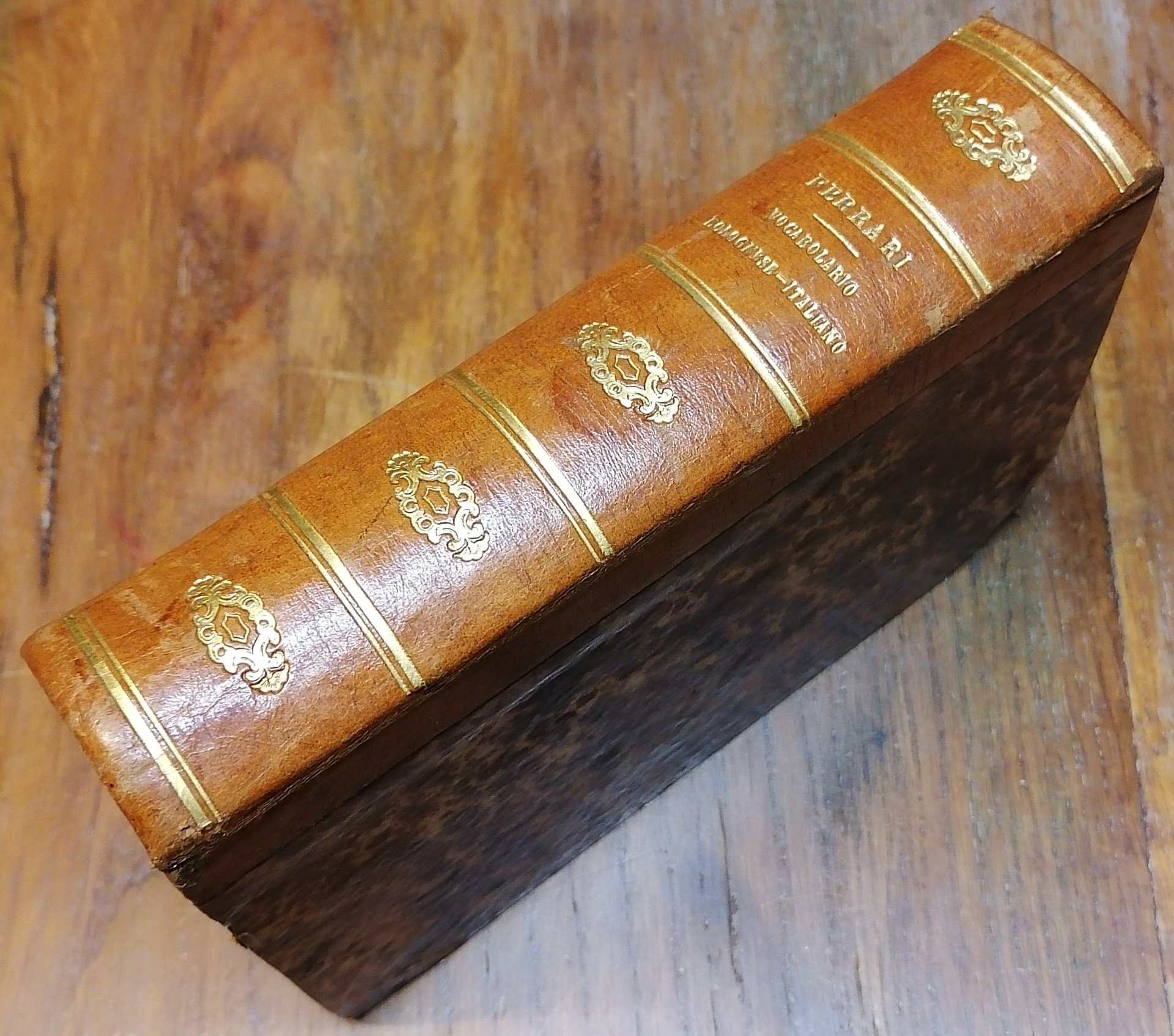 In 16° grande (cm 18 x 12), legatura coeva in mezza pelle con titoli ed impressioni in oro, pp. (4),LIII,(3),612 + pp. 90 di Appendice. Terza edizione compendiata, ed accresciuta di molte voci. Ottimo stato di conservazione.