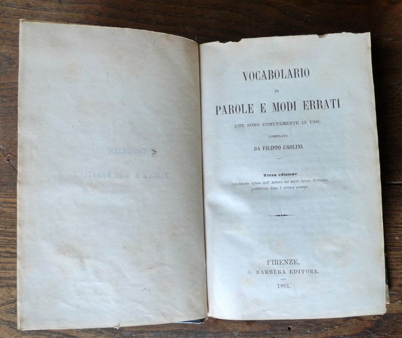 VOCABOLARIO DI PAROLE E MODI ERRATICHE SONO COMUNEMENTE IN USO,COMPILATO DA FILIPPO UGOLINI.TERZA EDIZIONEtotalmente rifusa dall'Autoresui molti lavori filologici,pubblicati dopo l'ultima stampa.FIRENZE, G. Barbèra Editore, 1861,copertina rigida, rilegatura coeva in mezza pelle,19x12 cm., pp.XXV-258,peso: g.300