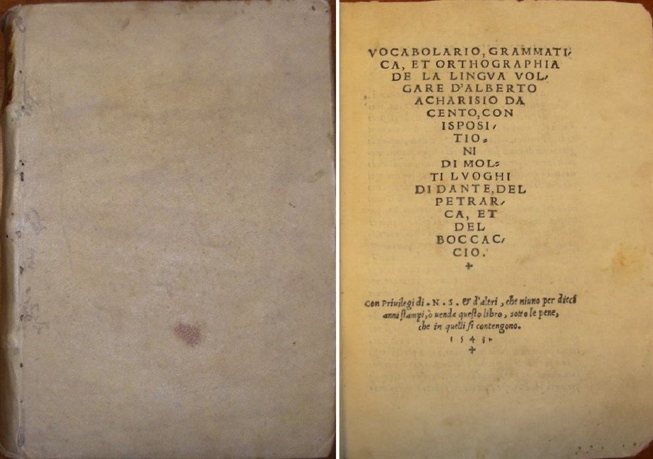 gr. vol. in-4 antico, ccnn 4, cc 316, leg. p. perg. settecentesca, tit. mss ai tagli. Dedicat. a Giacomo da Elisco di Savona. Alcune chiose di mano coeva. Ediz. orig. rarissima di uno dei primi vocabolari in volgare del giureconsulto Alberto Accarisi originario di Cento in Ferrara (1497ca - 1544) ed il primo libro stampato a Cento. Gamba 2753. Fumagalli, Lexicon, p.79. Minuscoli lavori di tarli sulle ultime 10 cc al margine bianco inf. senza lesioni al testo e lievi brun. in prossimità dell'angolo destro inferiore. Belliss. esempl. a larghi margini. [054]