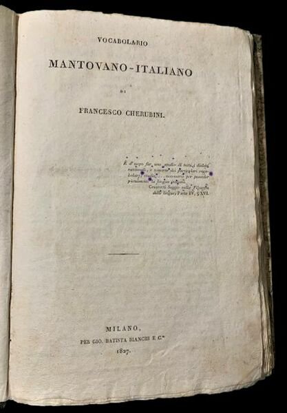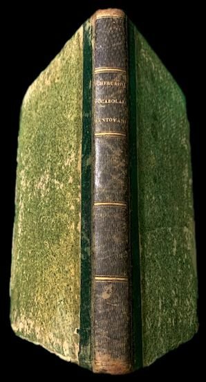 In 4°; XXVIII, 212 pp. Legatura coeva in mezza-pelle verde con titolo e filetti in oro al dorso. Due antichi disegni infantili nel margine bianco della seconda carta e per il resto esemplare in barbe ed in buone condizioni di conservazione. Antica nota di possesso al primo foglio bianco, in parte asportato, che identifica l'esemplare come appartenuto a Giannetta Riva Berni. Prima edizione di questo noto vocabolario mantovano-italiano, opera del celebre letterato milanese, Francesco Cherubini (Milano, 5 marzo 1789 Oliva di Lomaniga, 4 giugno 1851), al quale si deve il più celebre dizionario milanese-italiano mai pubblicato. Collaboratore del Giornale Italiano scrisse anche per la Biblioteca Italiana e sulla Rivista europea anche se in questo caso, quasi sempre in forma anonima. A lui si deve anche un'importante storia di Ostiglia nel mantovano e la celebre serie della Collezione delle migliori opere scritte in dialetto milanese(Milano 1816-17). Prima edizione, in buone condizioni di conservazione. Rif. Bibl.: IT\ICCU\PUVE\000732.